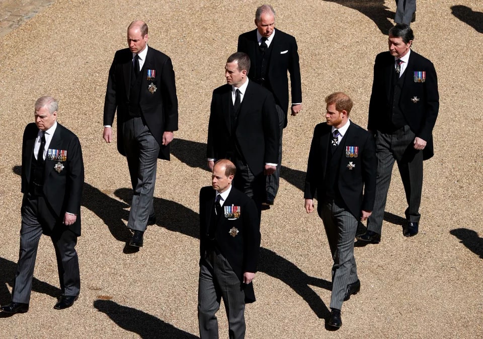 Την ίδια ώρα οι εγγονοί του πρίγκιπα Φιλίππου, πρίγκιπες Γουίλιαμ και Χάρι, ακολουθούσαν το φέρετρο του παππού τους, αλλά δεν κάθονταν δίπλα δίπλα. Ανάμεσά τους περπατούσε ένας εξάδελφός τους.