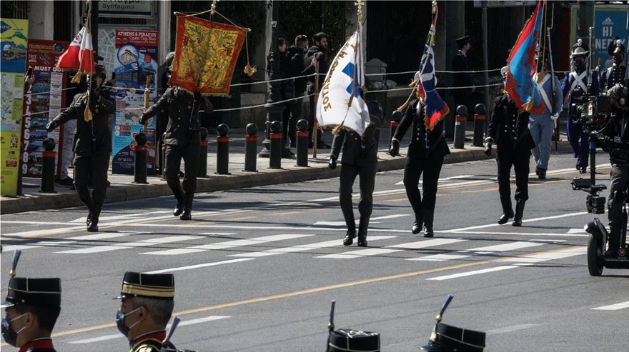 Σπουδαία στιγμή της παρέλασης ήταν, βεβαίως, η εμφάνιση των ιστορικών λαβάρων και των σημαιών της Επανάστασης. Τα περισσότερα από αυτά τα κειμήλια βγήκαν για πρώτη φορά από τις προθήκες τους. Το σύνθημα «Ελευθερία ή Θάνατος» είναι κοινό σχεδόν σε όλα τα λάβαρα και τις σημαίες, πλαισιωμένο από τα σύμβολα του σταυρού ή του φοίνικα. Επικεφαλής και σε περίοπτη θέση ήταν η σημαία της αδούλωτης Μάνης, σε μια παραλλαγή του ίδιου συνθήματος, ως «Νίκη ή Θάνατος». Δίπλα της η σημαία του Ιερού Λόχου, της Φιλικής Εταιρείας και της Αγίας Λαύρας.