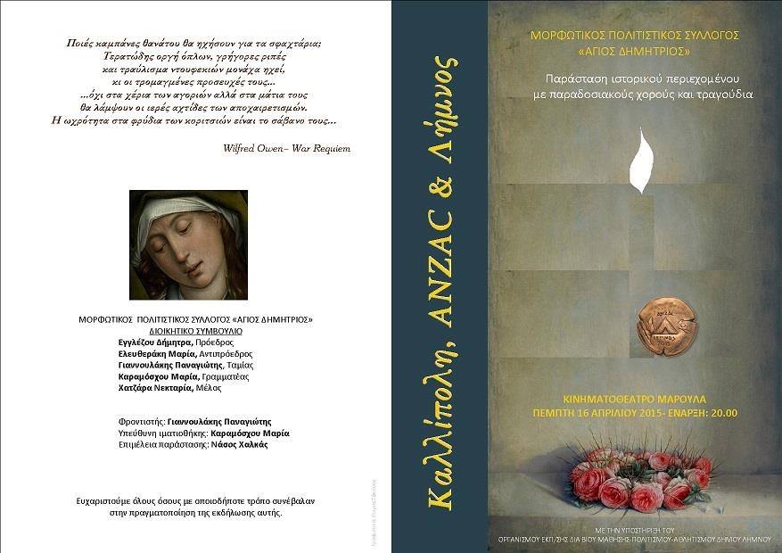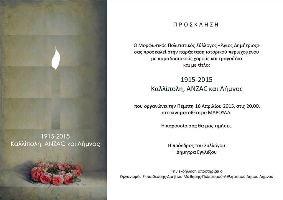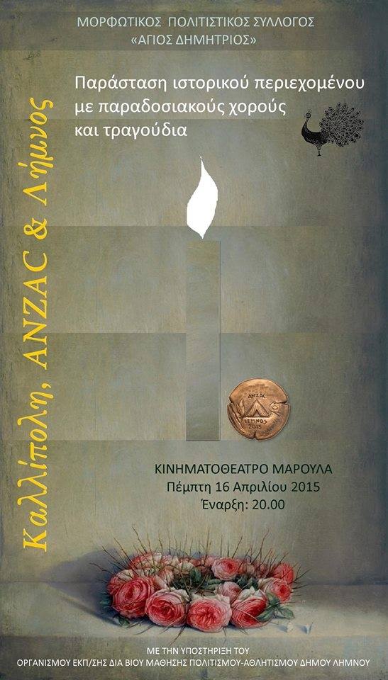 Η παράσταση προγραμματίζεται για την Πέμπτη του Πάσχα 16 Απριλίου στις 8 το απόγευμα στο κινηματοθέατρο «Μαρούλα» και έχει την υποστήριξη του Ο.Ε.Π.Α Δήμου Λήμνου.