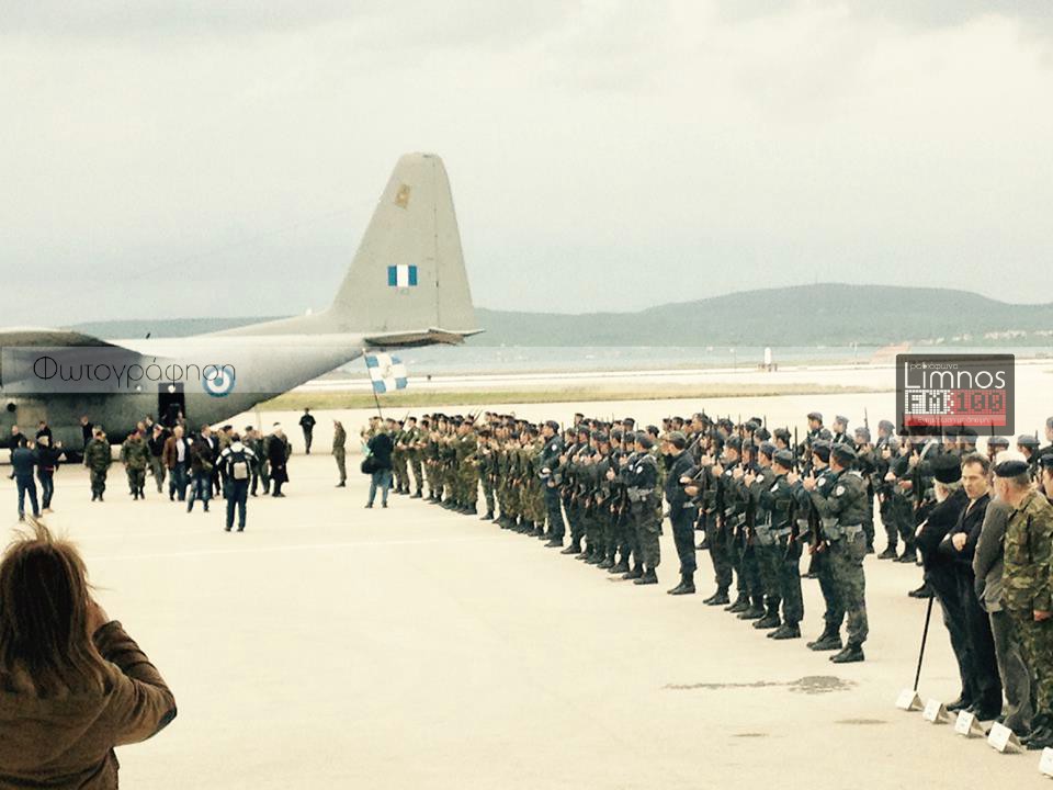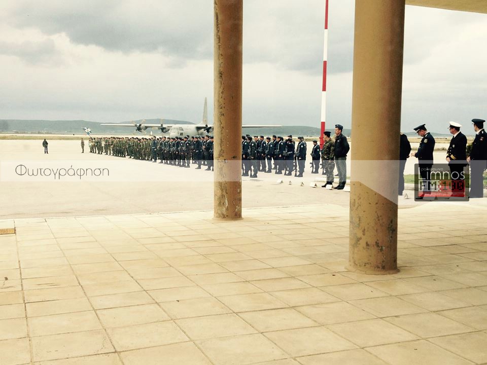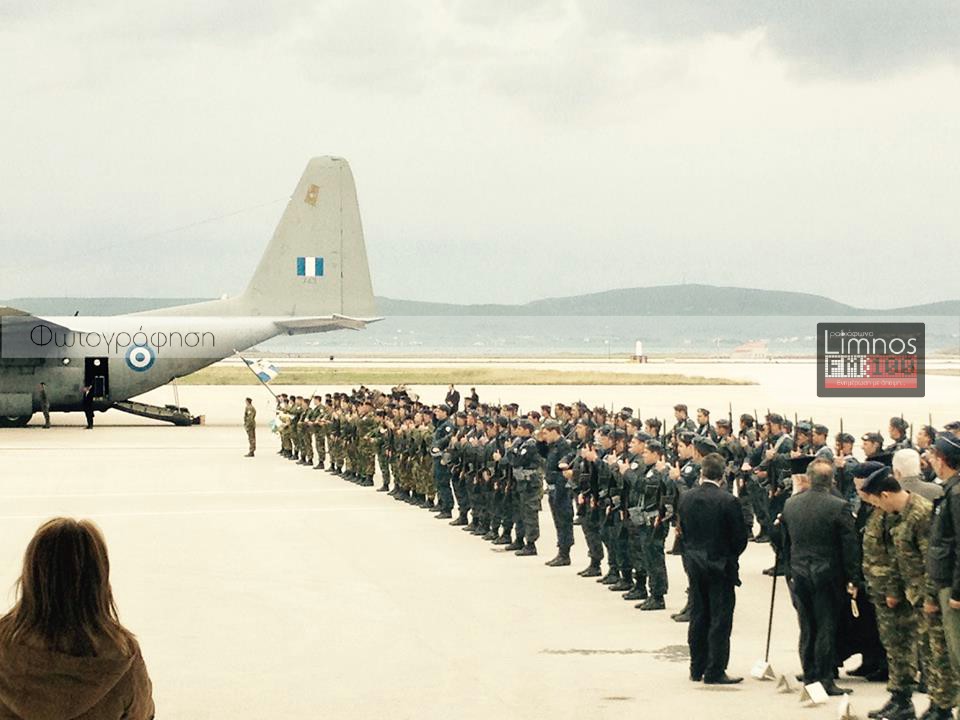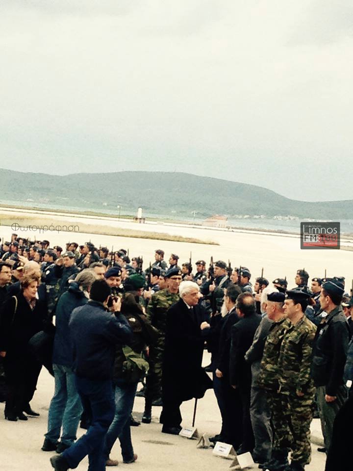 Τους επισήμους υποδέχθηκε Άγημα του Στρατού και της Πολεμικής Αεροπορίας, ενώ παρόντες στην υποδοχή ήταν η Περιφερειάρχης Βορείου Αιγαίου κα Χριστιάνα Καλογήρου, ο Γενικός Γραμματέας Αιγαίου και Νησιωτικής Πολιτικής κ. Γιάννης Γιαννέλης, ο Δήμαρχος Λήμνου, κ. Δημήτρης Μαρινάκης, ο Αντιδήμαρχος, κ. Σαράντης Πανταζής, ο Έπαρχος, κ. Βαγγέλης Γιαρμαδούρος και ο Μητροπολίτης Λήμνου και Αγίου Ευστρατίου, κ.κ. Ιερόθεος.