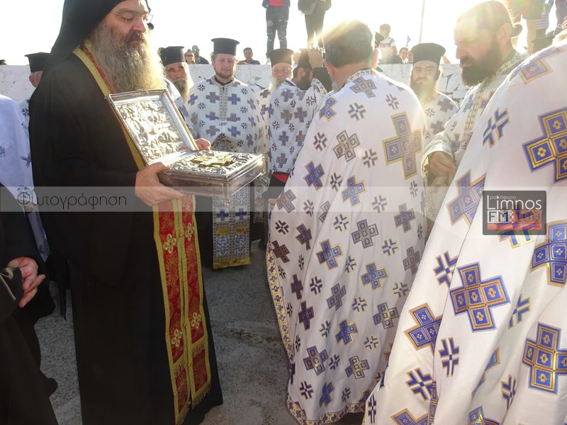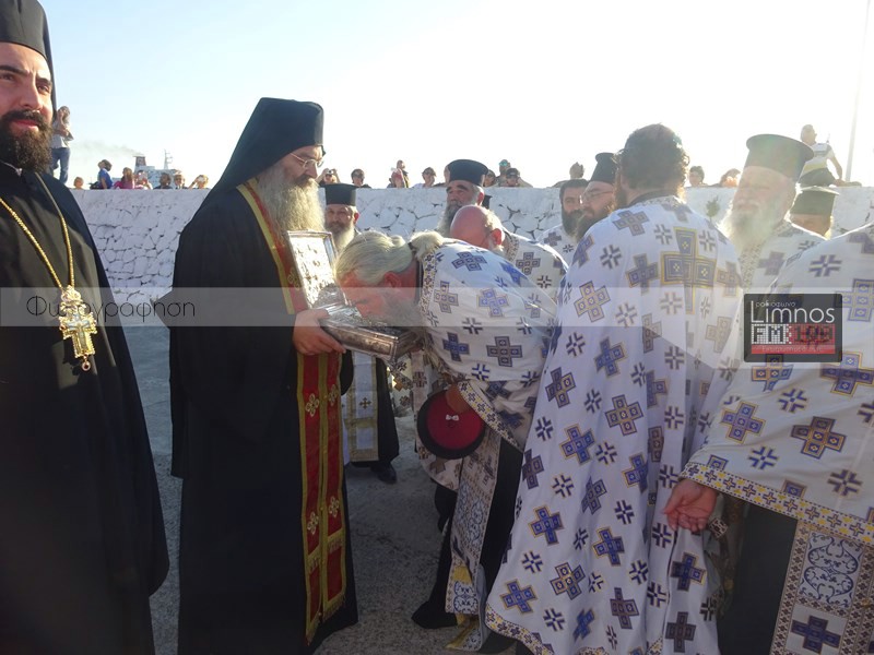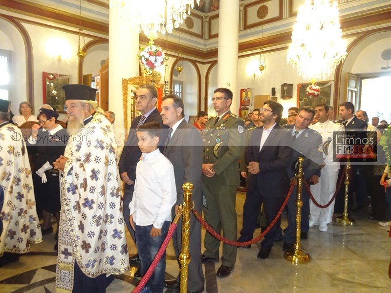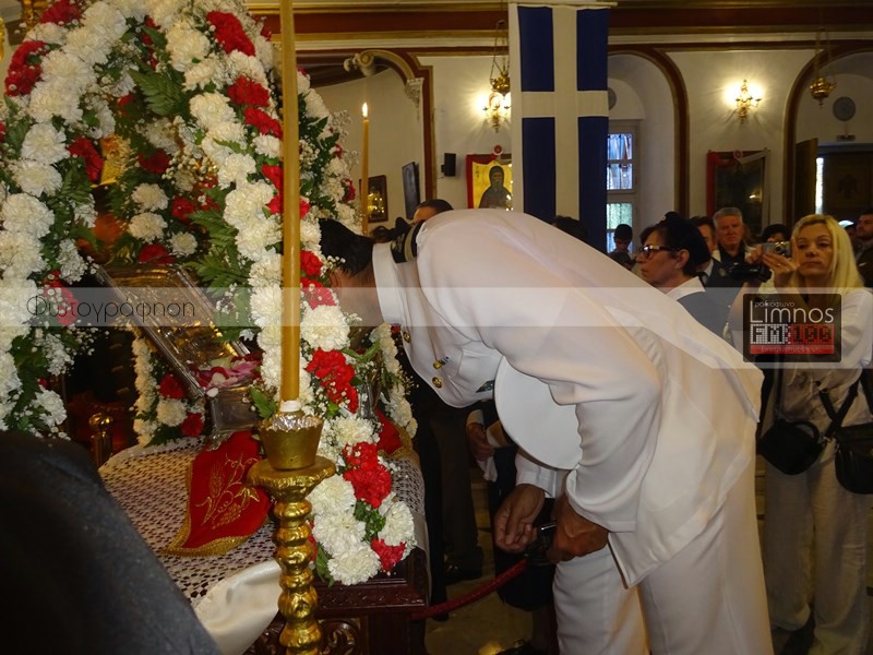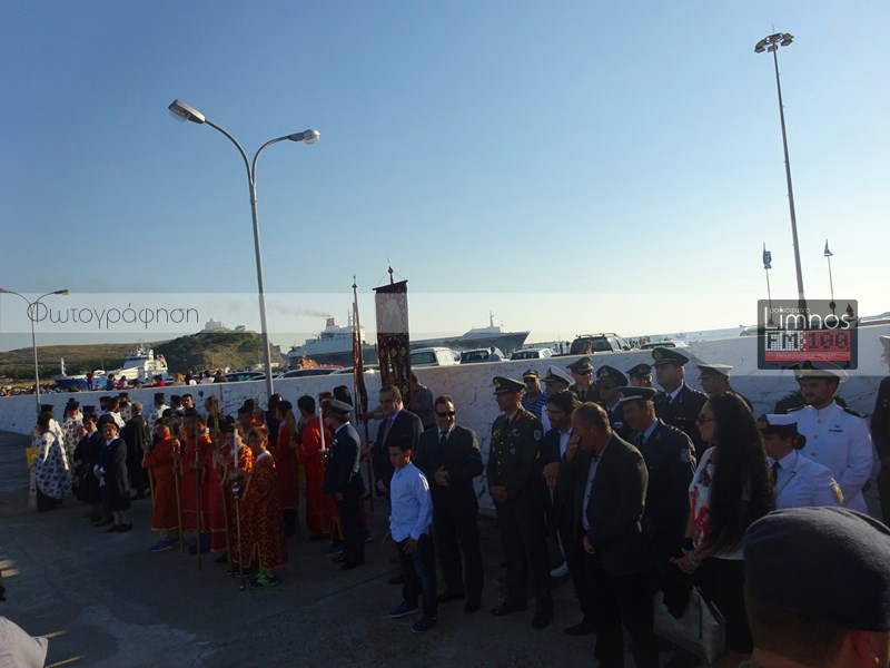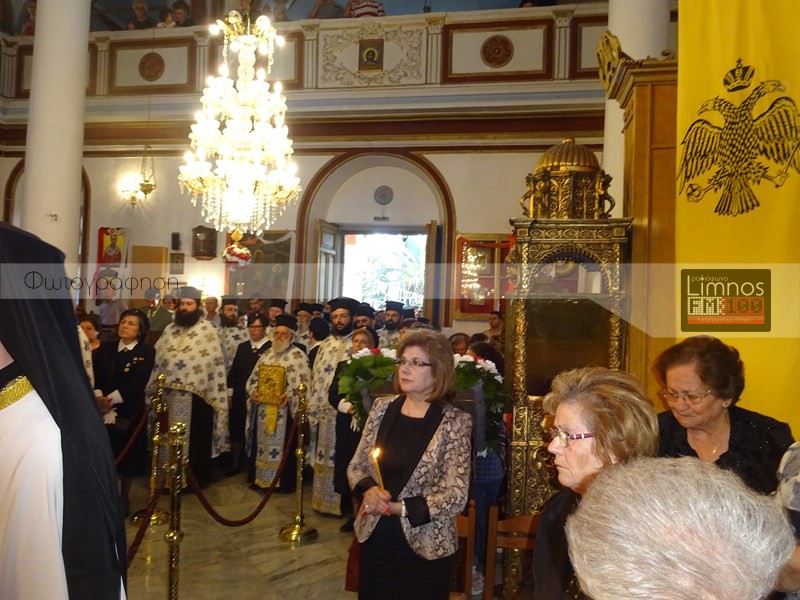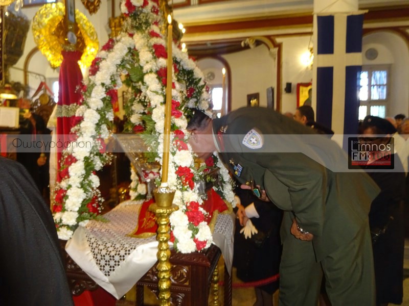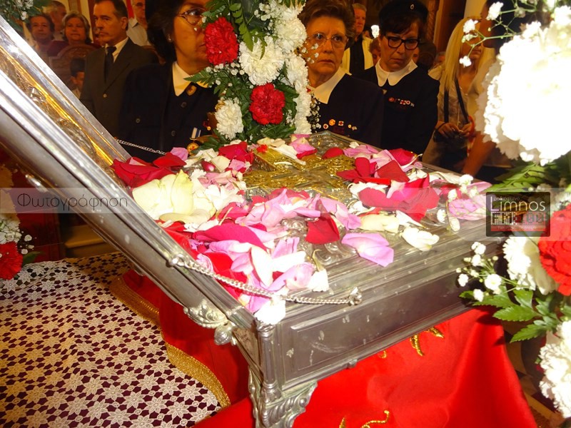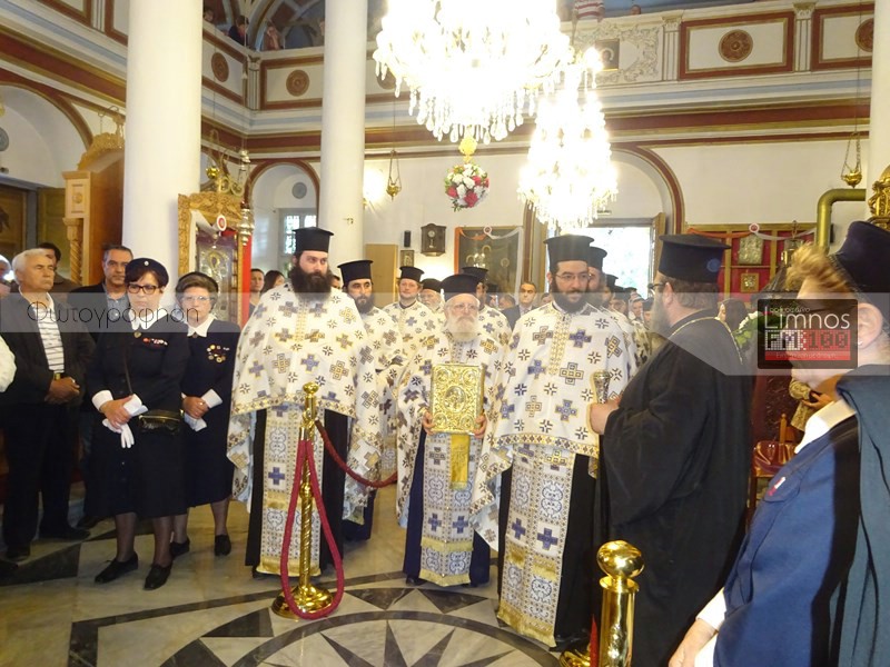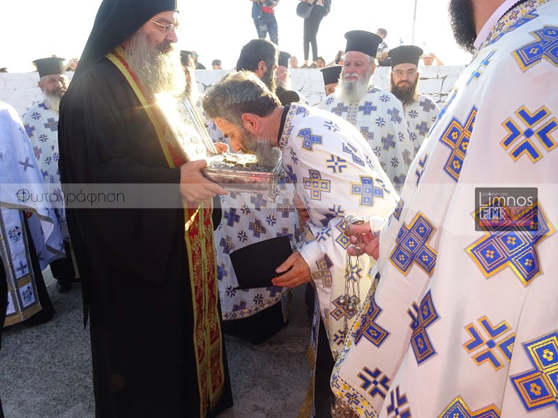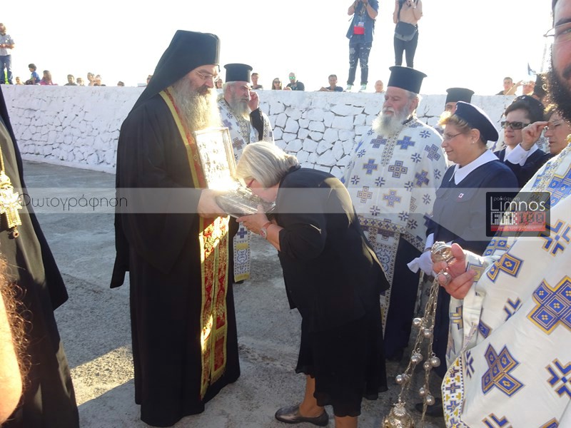 Το παρών στις εκδηλώσεις έδωσε η πολιτική και στρατιωτική ηγεσία του τόπου και των Ενόπλων Δυνάμεων, ο βουλευτής Νομού Λέσβου Χαράλαμπος Αθανασίου, ο Μητροπολίτης Λήμνου και Αγίου Ευστρατίου κ.κ Ιερόθεος, πλήθος ιερέων, καθώς και εκπρόσωποι του Ερυθρού Σταυρού και του Λυκείου Ελληνίδων Λήμνου. Μετά την άφιξη στον Ιερό Ναό Αγίας Τριάδας Μύρινας, οι άρχοντες του νησιού προσκύνησαν το ιερό τεμάχιο, ενώ ο Δήμαρχος Λήμνου απέφυγε να προσκυνήσει.