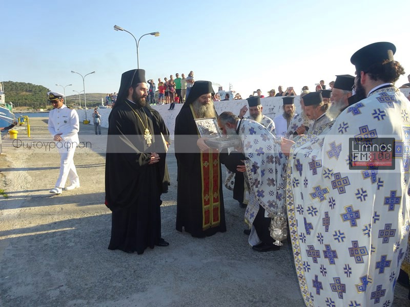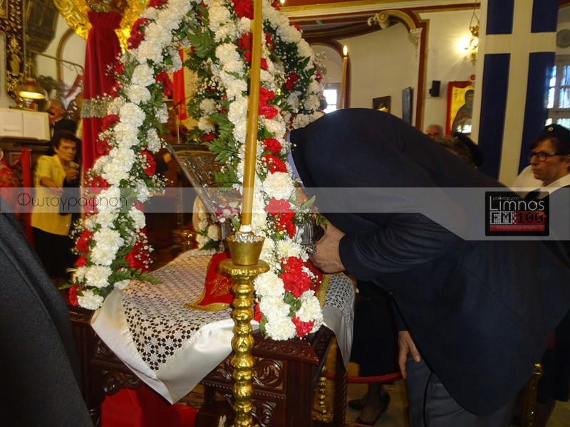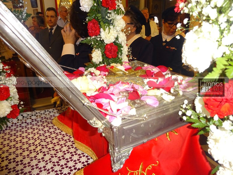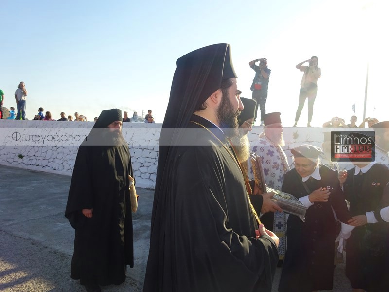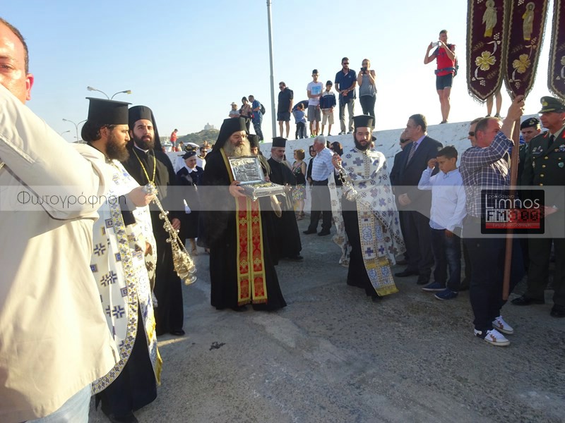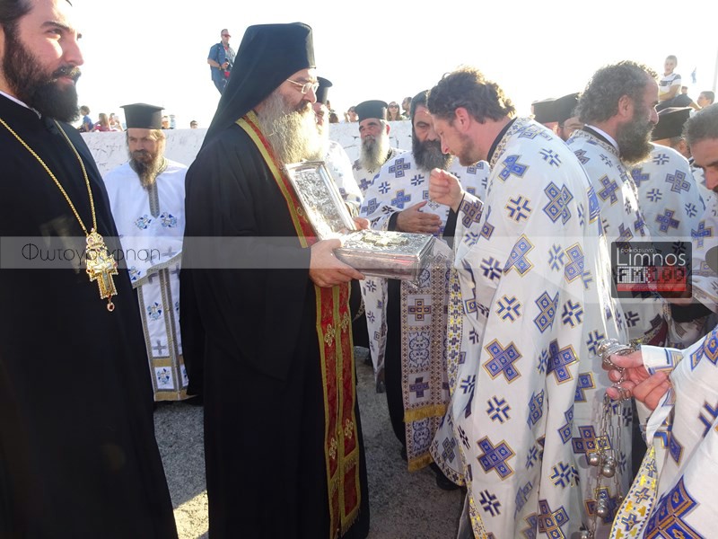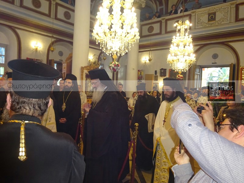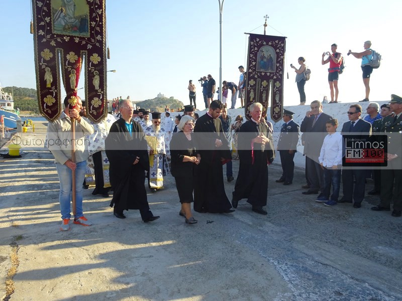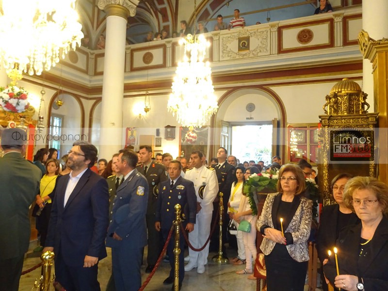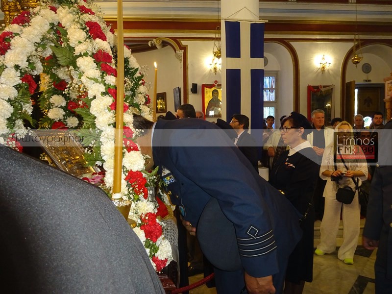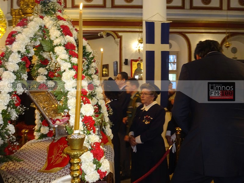 Το παρών στις εκδηλώσεις έδωσε η πολιτική και στρατιωτική ηγεσία του τόπου και των Ενόπλων Δυνάμεων, ο βουλευτής Νομού Λέσβου Χαράλαμπος Αθανασίου, ο Μητροπολίτης Λήμνου και Αγίου Ευστρατίου κ.κ Ιερόθεος, πλήθος ιερέων, καθώς και εκπρόσωποι του Ερυθρού Σταυρού και του Λυκείου Ελληνίδων Λήμνου. Μετά την άφιξη στον Ιερό Ναό Αγίας Τριάδας Μύρινας, οι άρχοντες του νησιού προσκύνησαν το ιερό τεμάχιο, ενώ ο Δήμαρχος Λήμνου απέφυγε να προσκυνήσει.