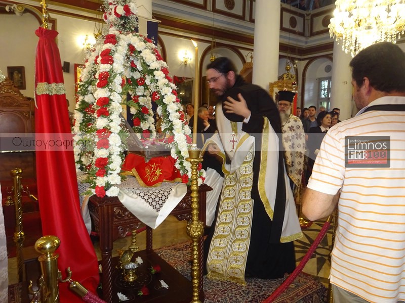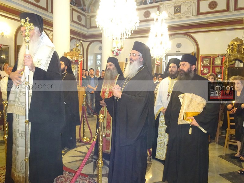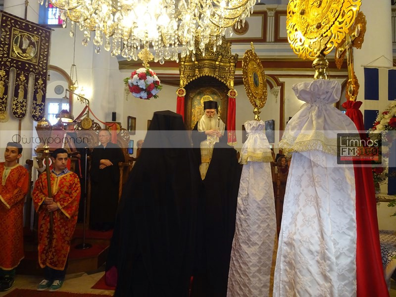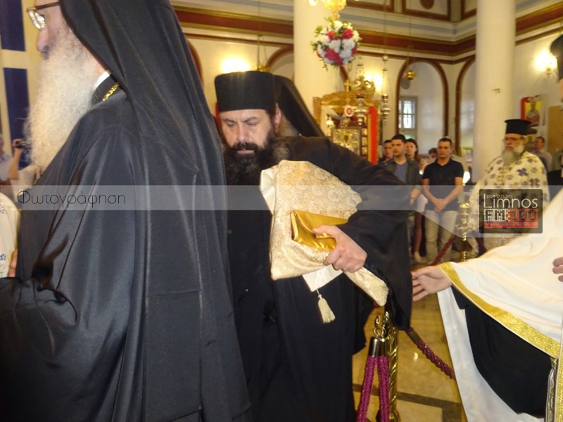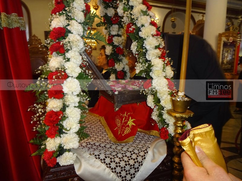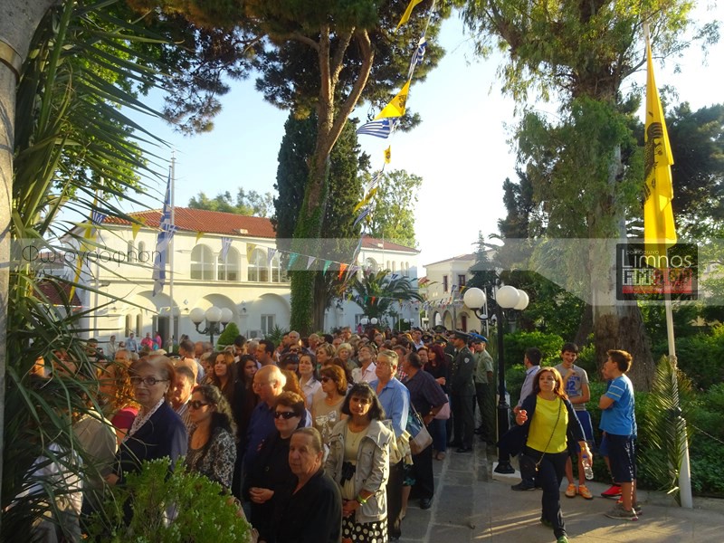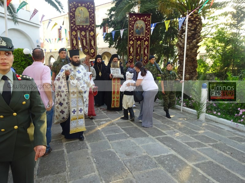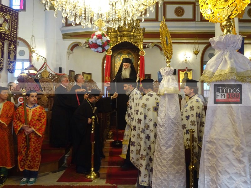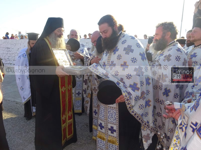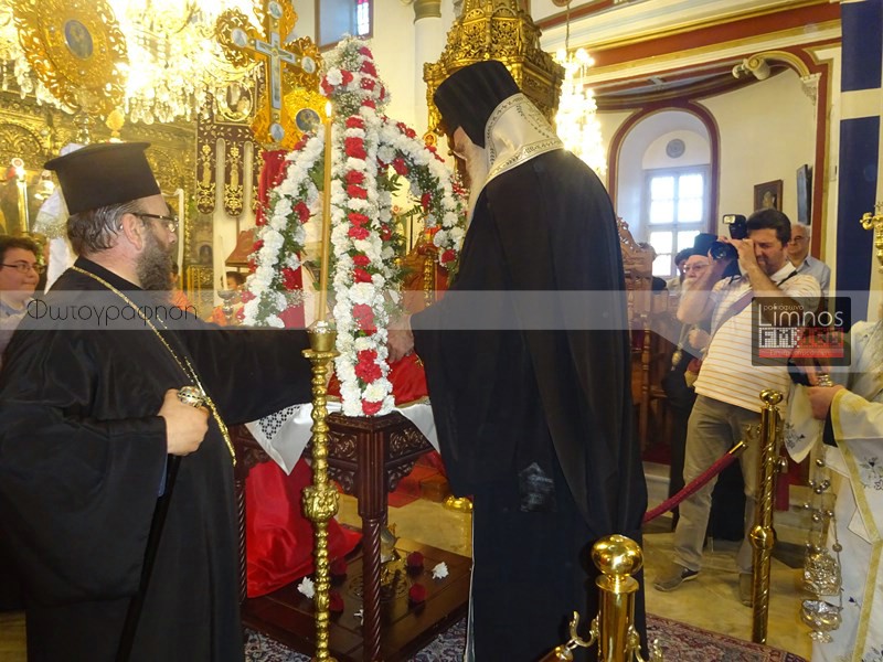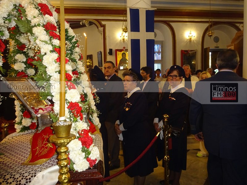 Το παρών στις εκδηλώσεις έδωσε η πολιτική και στρατιωτική ηγεσία του τόπου και των Ενόπλων Δυνάμεων, ο βουλευτής Νομού Λέσβου Χαράλαμπος Αθανασίου, ο Μητροπολίτης Λήμνου και Αγίου Ευστρατίου κ.κ Ιερόθεος, πλήθος ιερέων, καθώς και εκπρόσωποι του Ερυθρού Σταυρού και του Λυκείου Ελληνίδων Λήμνου. Μετά την άφιξη στον Ιερό Ναό Αγίας Τριάδας Μύρινας, οι άρχοντες του νησιού προσκύνησαν το ιερό τεμάχιο, ενώ ο Δήμαρχος Λήμνου απέφυγε να προσκυνήσει.