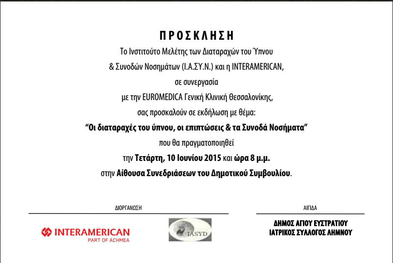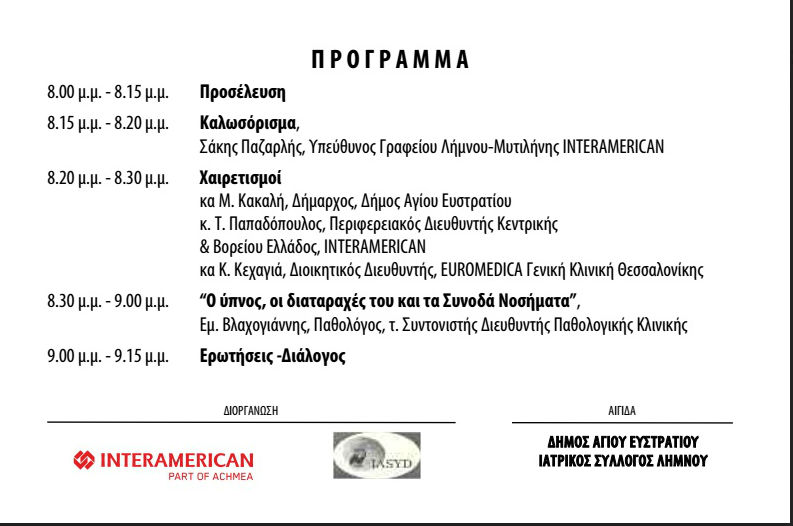 Σε αυτό το πλαίσιο και με τη συνεργασία του Ινστιτούτου Μελέτης των Διαταραχών του Ύπνου, η INTERAMERICAN οργανώνει εκδηλώσεις υγείας για τη νησιωτική κοινωνία του Αγίου Ευστρατίου.
