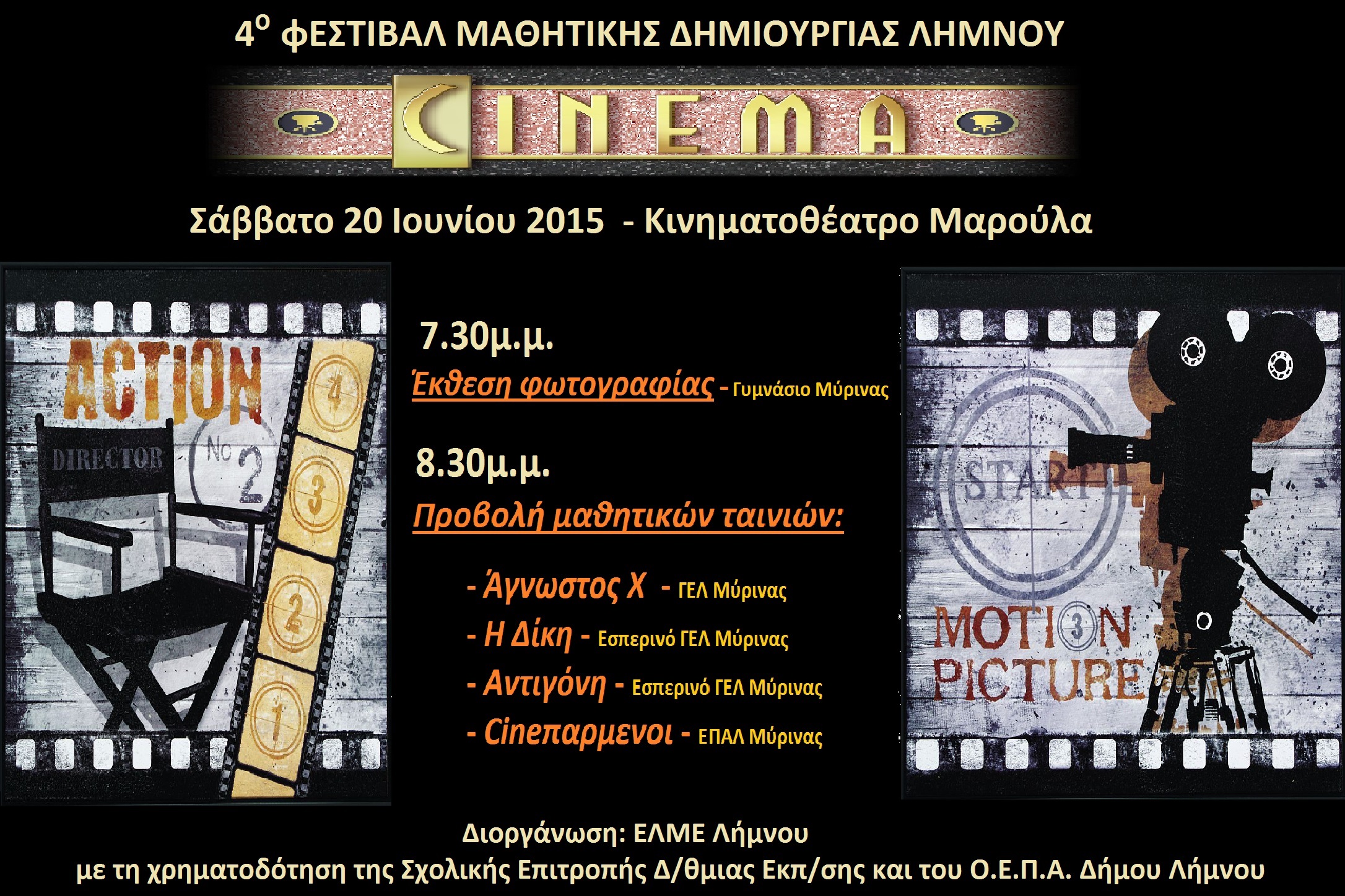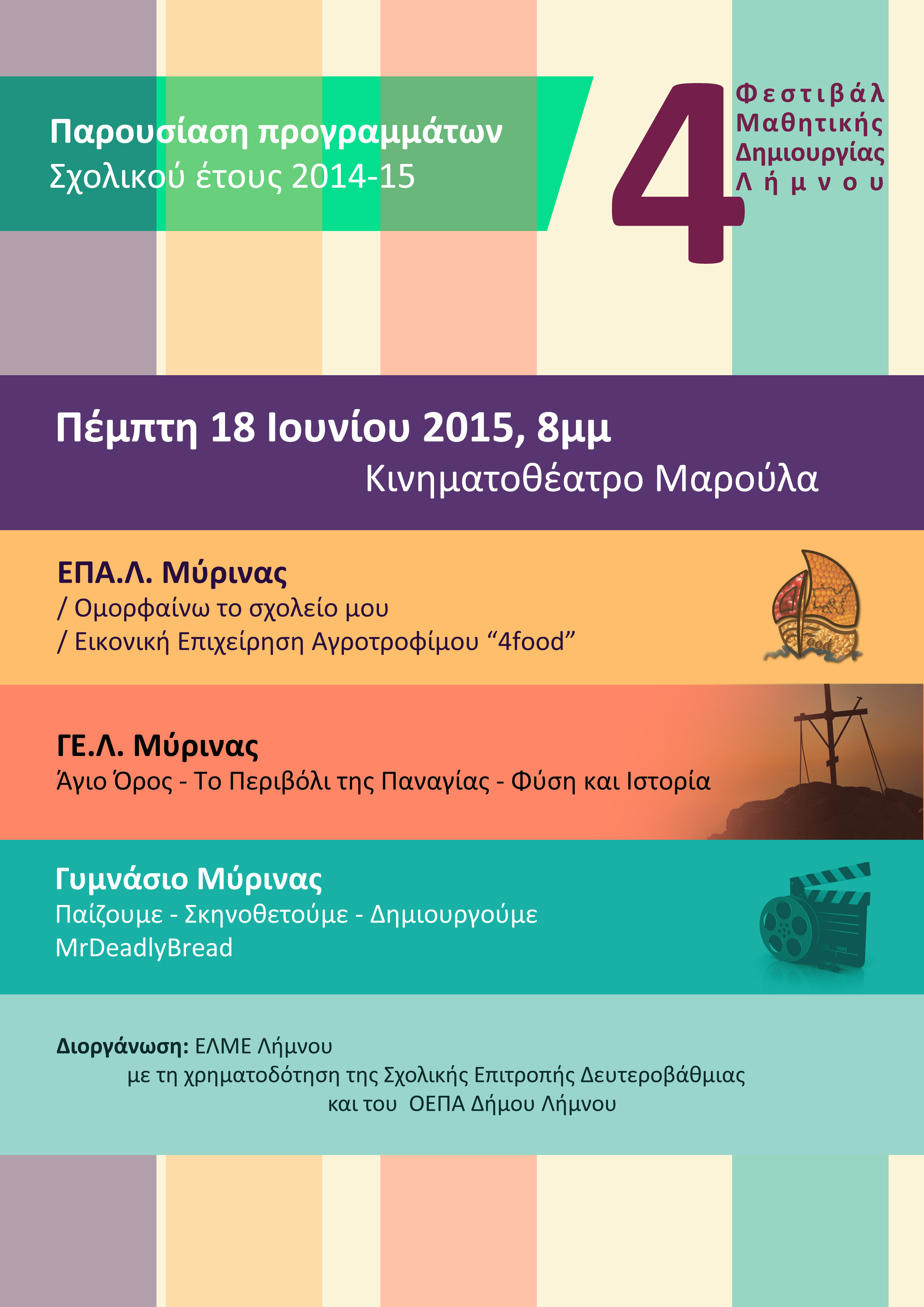 Τη χρηματοδότηση του φεστιβάλ ανέλαβαν η Σχολική Επιτροπή Δευτεροβάθμιας Εκπαίδευσης και ο Οργανισμός Εκπαίδευσης Πολιτισμού και Αθλητισμού του Δήμου Λήμνου και Η ΕΛΜΕ Λήμνου αισθάνεται την ανάγκη να τους ευχαριστήσει για αυτό.