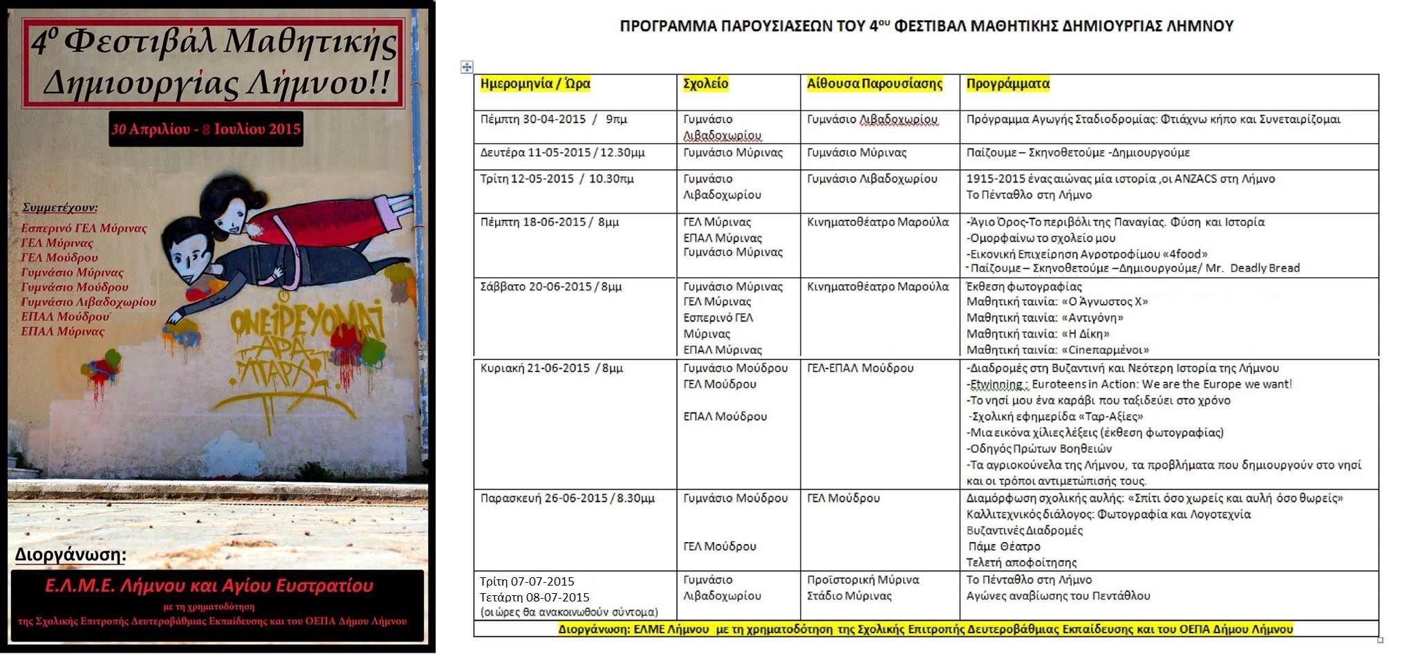 Στο φεστιβάλ αυτό, που ξεκίνησε στα τέλη του περασμένου Απριλίου και θα συνεχισθεί μέχρι τις αρχές Ιουλίου, παρουσιάζονται δράσεις και προγράμματα που πραγματοποιούν εκπαιδευτικοί με τους μαθητές τους σε όλα τα σχολεία δευτεροβάθμιας εκπαίδευσης του νησιού.