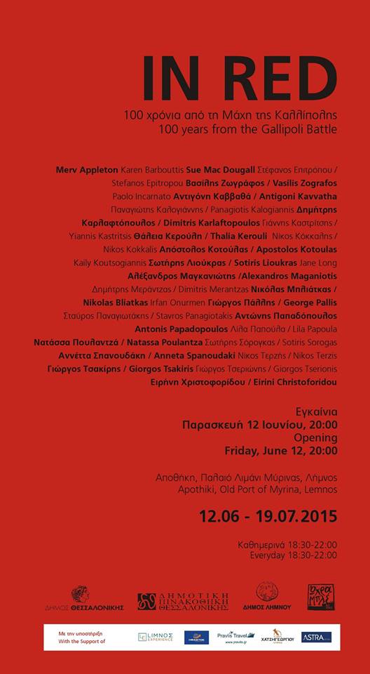 Η έκθεση "In red" αναπτύχθηκε στο διάστημα 2 Απριλίου-15 Μαΐου στη Δημοτική Πινακοθήκη της Θεσσαλονίκης και από εχθές ως και τις 19 Ιουλίου θα φιλοξενείται στη Λήμνο – στον "φυσικό της χώρο" (καθώς ασφαλές λιμάνι του Μούδρου στα ανατολικά του νησιού αποτέλεσε τη βάση των στρατευμάτων της Αντάτ κατά την εκστρατεία της Καλλίπολης..)