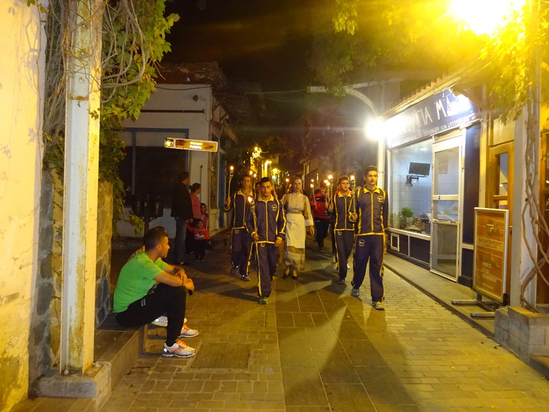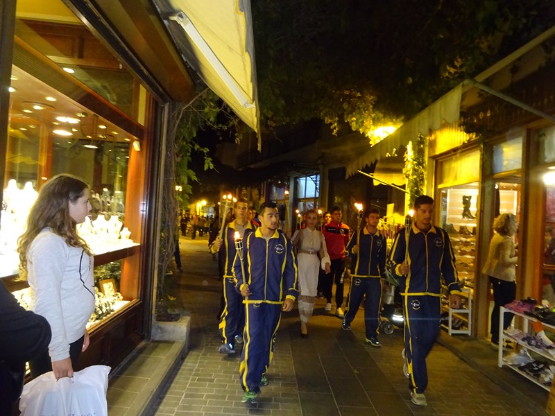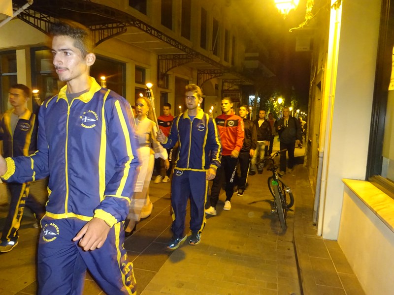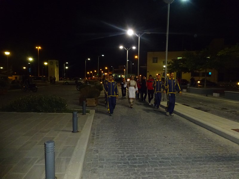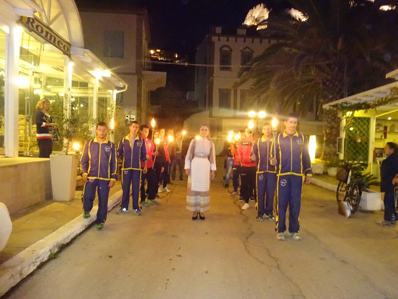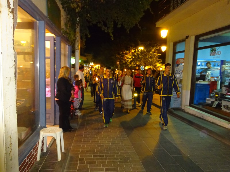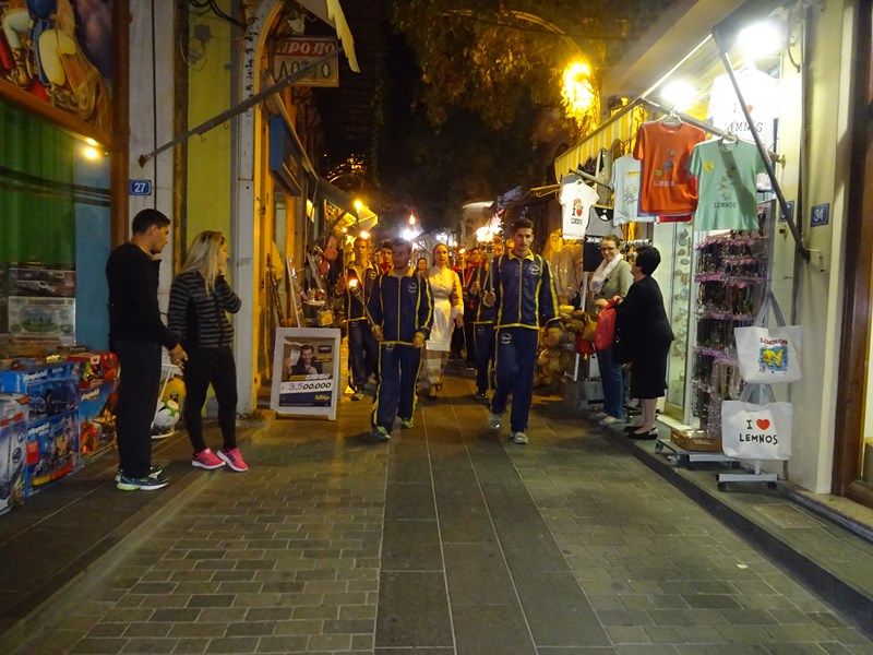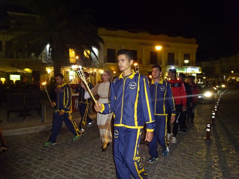 Έτσι εχθές πραγματοποιήθηκε λαμπαδηφορία με συμμετοχή αντιπροσωπειών από τα αθλητικά σωματεία του νησιού, η οποία ξεκίνησε από την αποβάθρα της Αγίας Παρασκευής στο Ρωμαίικο γιαλό (σημείο όπου αποβιβάστηκε το άγημα που ζήτησε την απελευθέρωση του νησιού), διέσχισε την αγορά και κατέληξε στο Δημαρχείο.