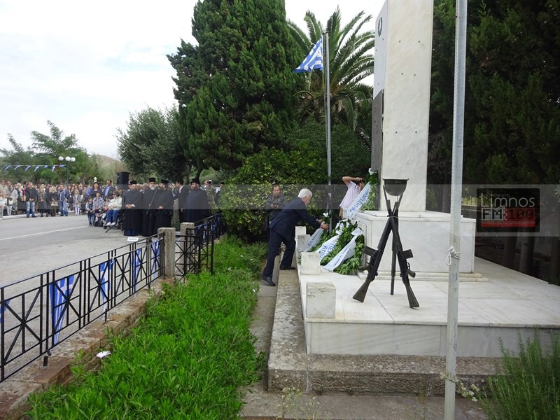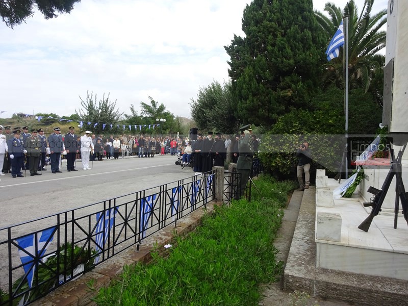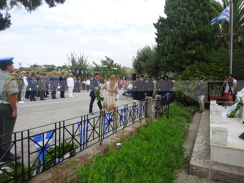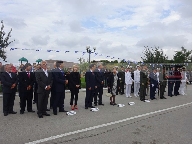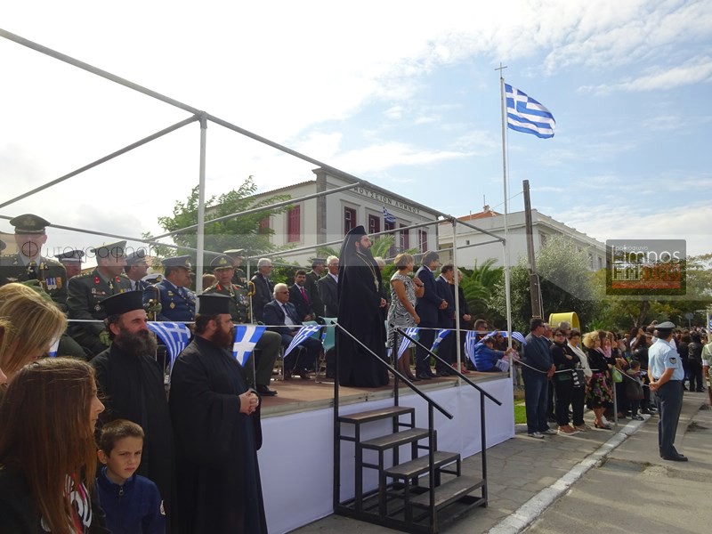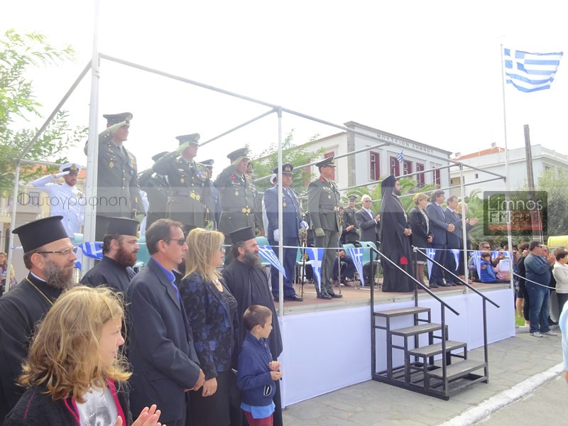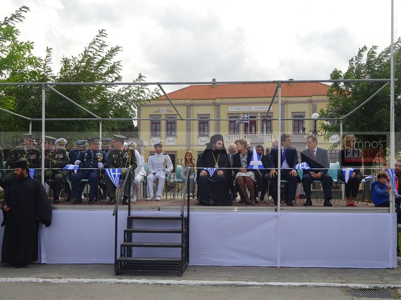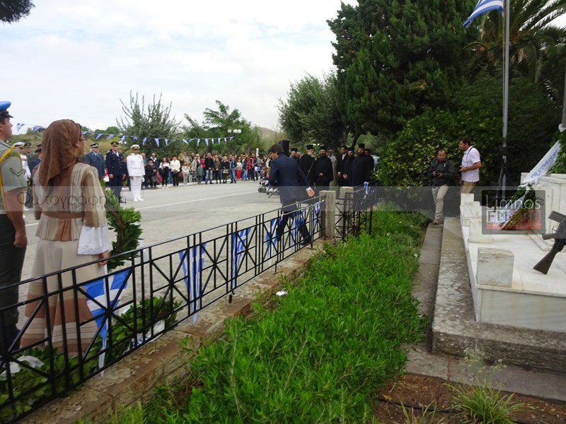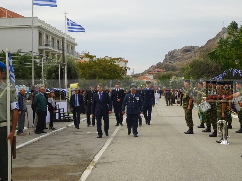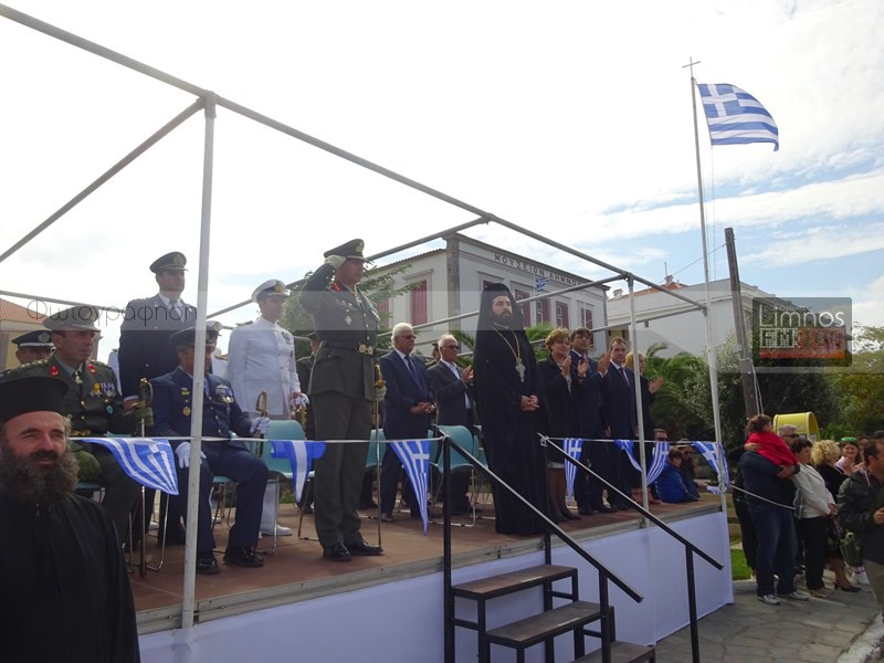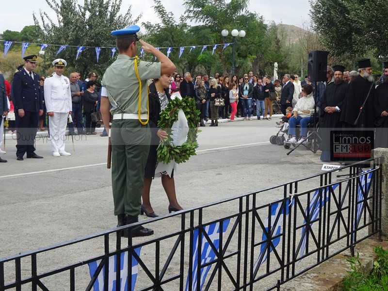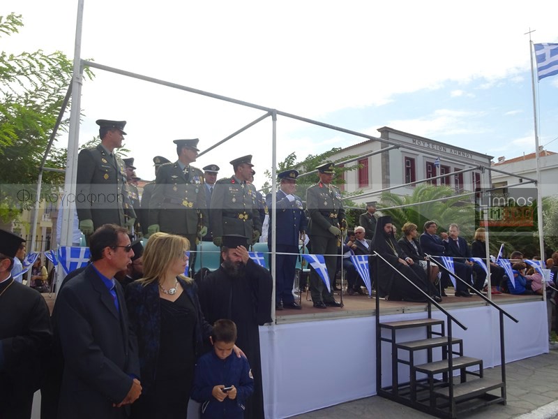 Πριν την έναρξη της παρέλασης, πραγματοποιήθηκε η κατάθεση στεφάνων. Στη συνέχεια, στην εξέδρα των επισήμων, μεταξύ άλλων, παρέστησαν η Περιφερειάρχης Β. Αιγαίου Χριστιάνα Καλογήρου, ο Έπαρχος Λήμνου Βαγγέλης Γιαρμαδούρος, ο Δήμαρχος Λύσης Κύπρου κ. Συμεών Παστός, ο Δήμαρχος Λήμνου Δημήτρης Μαρινάκης, η Δήμαρχος Αγίου Ευστρατίου Μαρία Κακαλή, ο στρατιωτικός Διοικητής της 88 ΣΔΙ Κωνσταντίνος Κούτρας και εκπρόσωποι της στρατιωτικής και θρησκευτικής ηγεσίας. Εκπρόσωπος της κυβέρνησης θα πρέπει να αναφερθεί πως φέτος δεν υπήρξε.