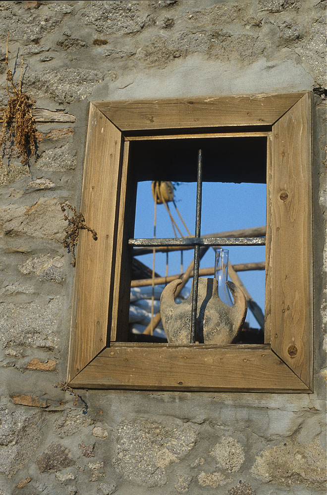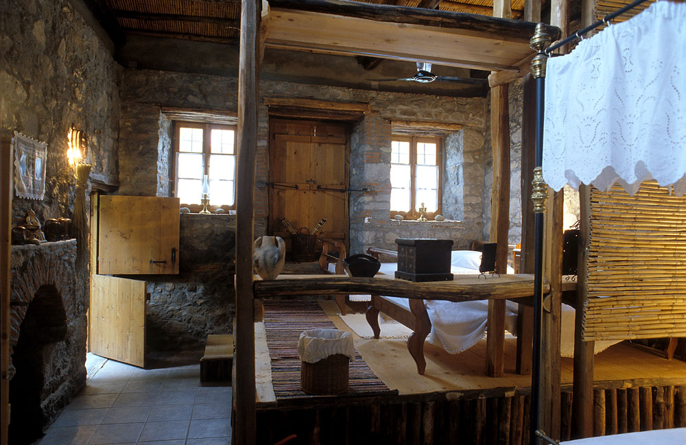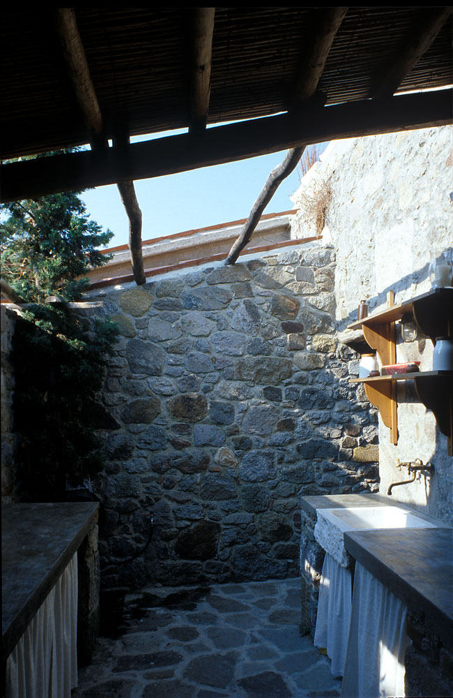 Για να επιτευχθούν όσα προαναφέρθηκαν η στέγη αποκαταστάθηκε πλήρως μόνο στον έναν ορθογωνικό χώρο. Έγινε έτσι ιδανικός χώρος υπνοδωματίου για τους καλοκαιρινούς μήνες, δροσερός και ανήλιος. Για να μην αλλοιωθεί η παλιά όψη του κτίσματος, διατηρήθηκαν τα ανοίγματα, τα δύο παράθυρα και η παλιά πόρτα, χωρίς όμως αυτή να χρησιμοποιείται για πρόσβαση στην κατοικία. Για την ανάγκη φιλοξενίας μιας οικογένειας ή μια παρέας, το μονόχωρο διαμορφώθηκε σε δύο επίπεδα. Ο χώρος των παιδιών, ένα καθαρό τετράγωνο σε κάτοψη, υψώθηκε δύο σκαλοπάτια πάνω από τον υπόλοιπο χώρο, και ξεχώρισε. Δίπλα στο υπνοδωμάτιο, στη παλιά αυλή, τοποθετήθηκε το λουτρό που στεγάστηκε και αυτό κανονικά. Η κουζίνα που βρίσκεται απέναντι του έχει την ίδια στέγαση παραμένει όμως ανοιχτή από την μία πλευρά και συνδέεται με τον χώρο του φαγητού.