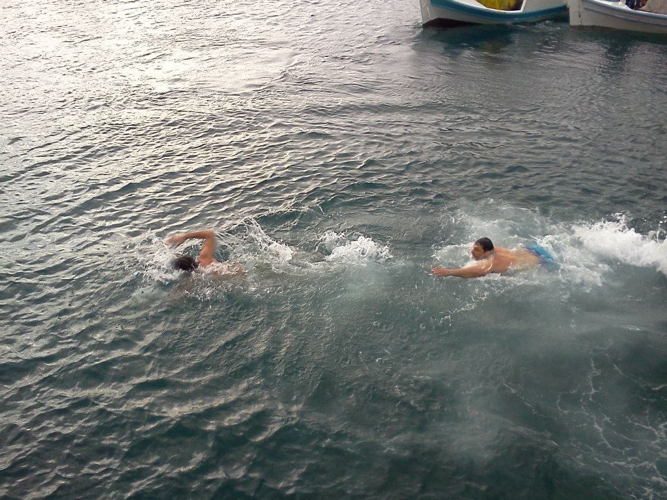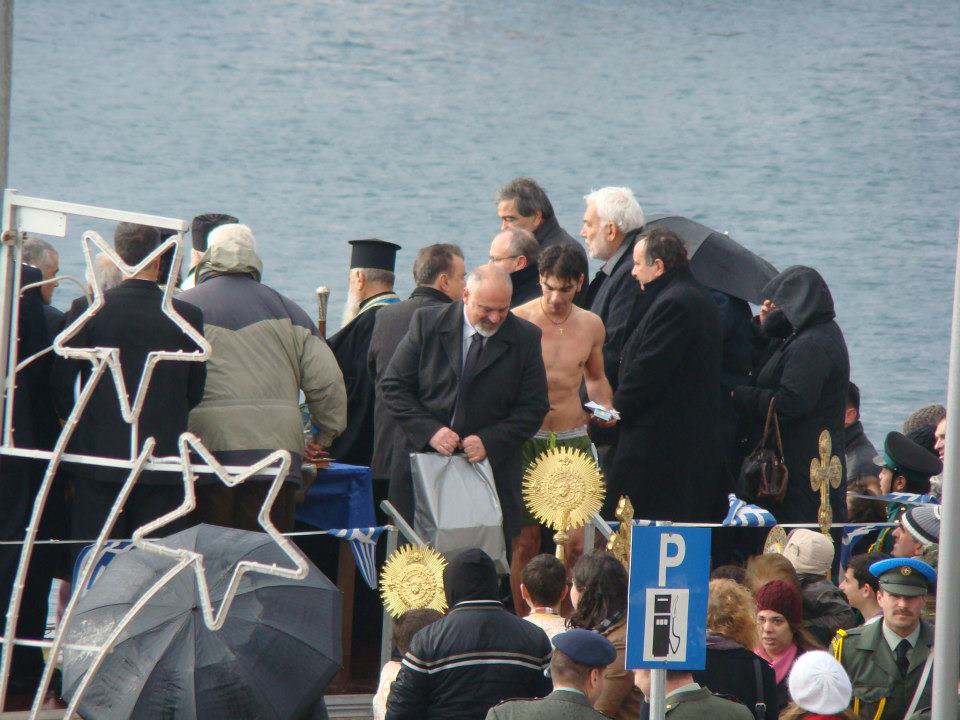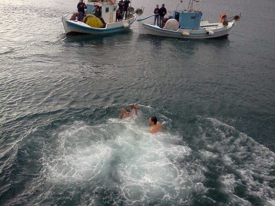 Δύο ήταν οι θαραλλέοι που αψήφισαν το κρύο και τα παγωμένα νερά και βούτηξαν να πιάσουν τον Τίμιο Σταυρό, υπό τους ήχους των κανονιοβολισμών που προέρχονταν από το πλοίο του Πολεμικού Ναυτικού που είναι αγκυροβολημένο στο λιμάνι της πόλης.