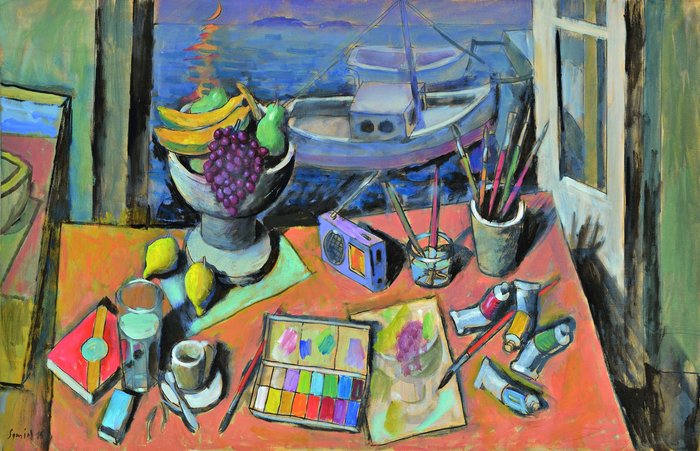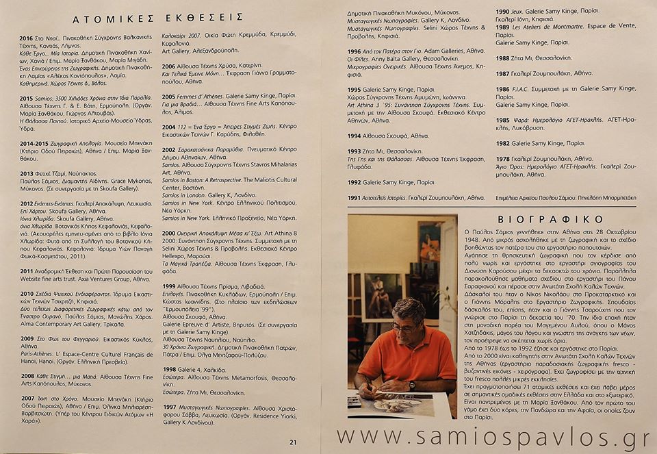 Δεν λείπουν και τα πινέλα του ζωγράφου αλλά και αυτό το ίδιο το ατελιέ με το ανοικτό παράθυρο στη θάλασσα, που γίνεται φορέας έμπνευσης και δημιουργίας. Ο Παύλος Σάμιος ανοίγει το χώρο δουλειάς του, μας βάζει στο εργαστήρι του, που αυτή τη φορά βρίσκεται «Στο Νησί...», μας κάνει συμμέτοχους και συνδημιουργούς.
