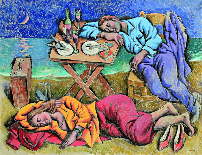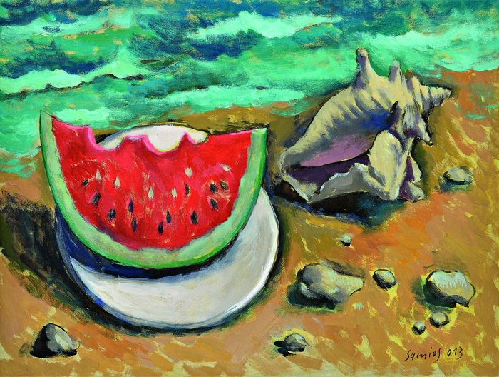 Η θάλασσα είναι πανταχού παρούσα είτε ως συνέχεια μιας παρτίδας τάβλι, ή ενός καλοκαιρινού, απλού γεύματος, είτε ως σιωπηλός παρατηρητής μιας τρυφερής συνύπαρξης ανάμεσα σ έναν άντρα και μια γυναίκα. Τα αιώνια σύμβολα του καλοκαιριού είναι εδώ: μια δροσερή φέτα καρπούζι, ένα ζουμερό σταφύλι, ένα ποτήρι κρασί, το τρανζίστορ στην αμμουδιά, τα μικρά εκκλησάκια.