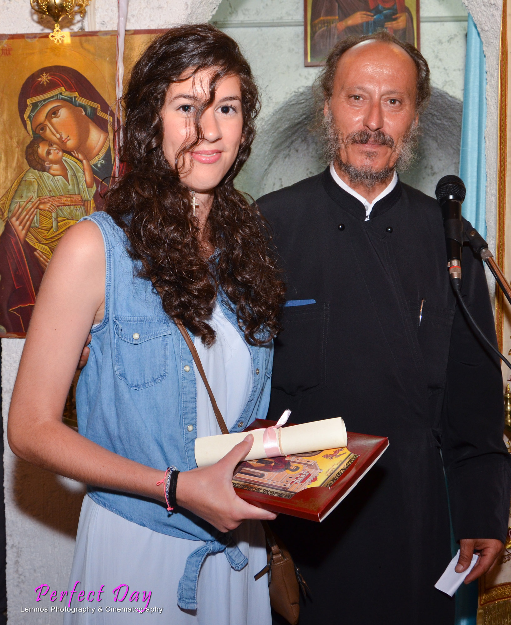 Αυτή τη ξεχωριστή βραδιά το εκκλησιαστικό συμβούλιο των ναών της ενορίας τίμησαν και βράβευσαν δια χειρός του πάτερ Απόστολου την Χριστίνα-Μεγεθώ Γκαλιούρη ως την πρώτη αριστεύσασα απόφοιτη Γενικού Λυκείου Μύρινας με βαθμό απολυτηρίου 19,6 (!), για το σχολικό έτος 2015-2016 στη Λήμνο για να τη συνοδεύει η χάρη της Αγίας στη συνέχεια της ακαδημαϊκής της πορείας.