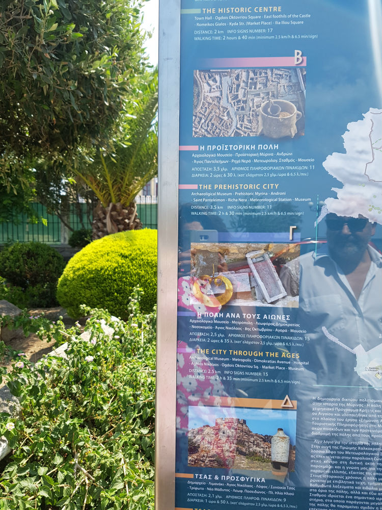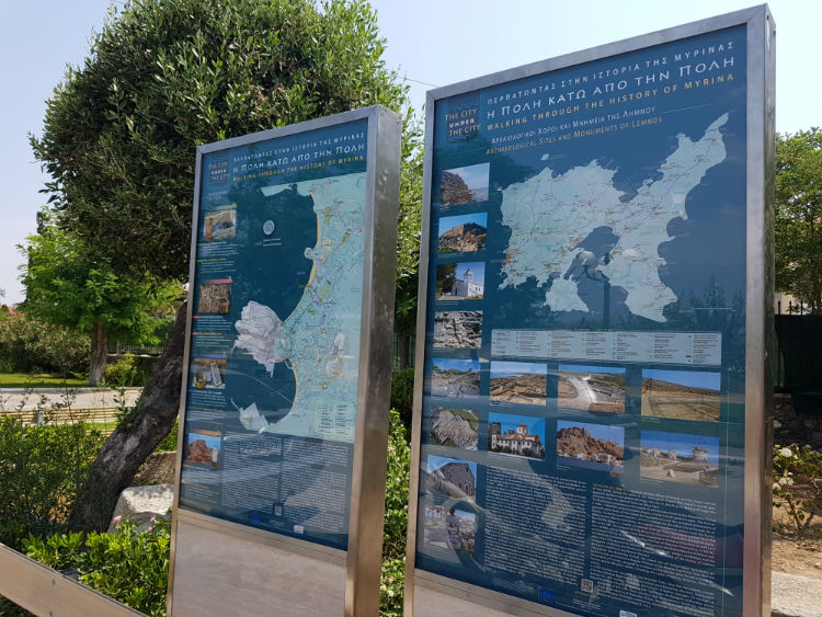 Επίσης, υπάρχει πληροφοριακό υλικό στα ελληνικά, τα αγγλικά και τα ιταλικά, με τον αντίστοιχο χάρτη της διαδρομής, που διανέμεται σε ειδικά περίπτερα που έχουν τοποθετηθεί σε σημεία υψηλού τουριστικού ενδιαφέροντος (τουρκικός γιαλός, αεροδρόμιο, λιμάνι, μουσεία επαρχείο, δήμος κλπ). Στις κομβικές πινακίδες πληροφόρησης, όπως στο λιμάνι και στο αεροδρόμιο, υπάρχει barcode με το οποίο ο ενδιαφερόμενος μπορεί μέσω smartphone να λάβει περισσότερες πληροφορίες για κάθε αρχαιολογική θέση, ενώ στη διάθεση του κοινού είναι και ο ιστότοπος www.myrina.gr.