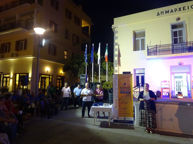 Στην έναρξη της εκδήλωσης, ο Πρόεδρος του Οργανισμού Εκπαίδευσης Δια Βίου Μάθησης Πολιτισμού και Αθλητισμού του Δήμου Λήμνου κ. Νικόλαος Μαρινάκης μετέφερε το καλωσόρισμα του Δημάρχου κ. Δημήτρη Μαρινάκη προς τους ιστιοπλόους και τους διοργανωτές της Aegean Regatta 2016, ενώ ο Γενικός Διευθυντής της Γενικής Γραμματείας Αιγαίου και Νησιωτικής Πολιτικής κ. Παύλος Μιχαλακέλλης μετέφερε το χαιρετισμό του Γενικού Γραμματέα κ. Ιωάννη Γιαννέλη Θεοδοσιάδη. Ευχαρίστησε «το Δήμο και τους κατοίκους της Λήμνου, αυτού του όμορφου νησιού που μας υποδέχεται και μας προσφέρει μια πολύ όμορφη φιλοξενία, όλους τους εργαζόμενους που στηρίζουν την προσπάθεια αυτή, η οποία διοργανώνεται για 16η φορά από τη Γενική Γραμματεία Αιγαίου και Νησιωτικής Πολιτικής» και ευχήθηκε σε όλους καλή επιτυχία στο υπόλοιπο των διαδρομών.