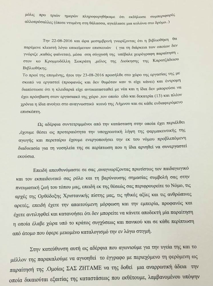Με βάση τα όσα ανέφερε ο κ. Χασάπης στο σταθμό μας, η 49χρονη δεν κατάφερε να διαχειριστεί ένα οικογενειακό πρόβλημα και κάτω από συνθήκες σύγχυσης και πανικού κατέθεσε εγγράφως την παραίτηση από τη δουλειά της. Την επόμενη ημέρα πήγε στη βιβλιοθήκη για να εργαστεί κανονικά (προφανώς δεν θυμόταν καν τι είχε κάνει) και διαπίστωσε ότι η κλειδαριά είχε αντικατασταθεί με νέα και ως εκ τούτου η ίδια δεν μπορούσε να έχει πρόσβαση στην εργασία της.