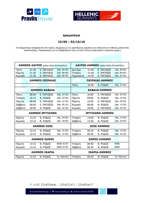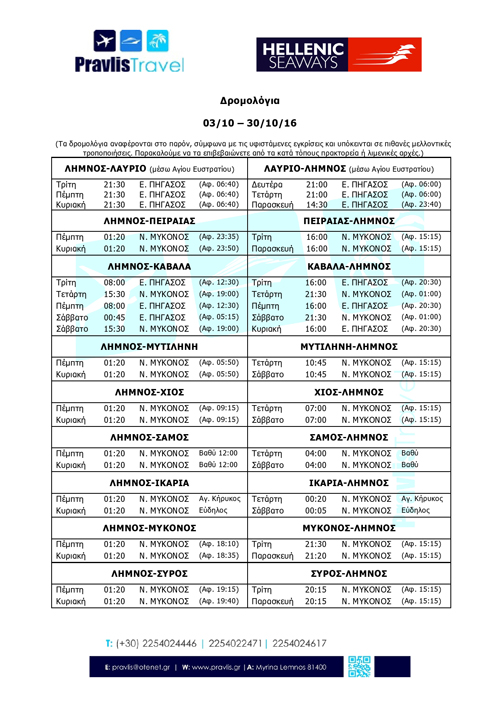 Αξίζει βέβαια να σημειωθεί ότι το πρόγραμμα της εταιρίας μετά τις 2 Οκτωβρίου είναι σαφέστατα βελτιωμένο, με βραδινά δρομολόγια από και προς Λαύριο τρεις φορές την εβδομάδα και σχεδόν καθημερινή σύνδεση με Καβάλα χωρίς όμως να υπάρχει η δυνατότητα να ταξιδέψει κάποιος από Λήμνο για Καβάλα και τούμπαλιν το Σαββατοκύριακο.