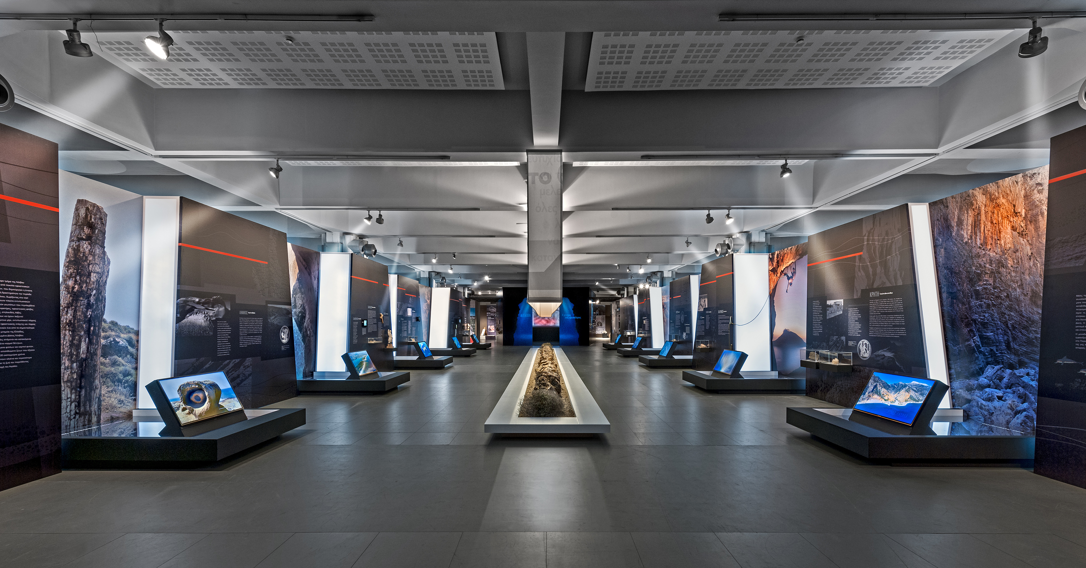 • «Στα νησιά του Ηφαίστου και του Ποσειδώνα». Το μεγαλύτερο μέρος του Αιγαίου χρωστά την ύπαρξή του στα ηφαίστεια, μερικά από τα οποία είναι ακόμα ενεργά, όπως αυτά της Σαντορίνης, της Νισύρου, της Μήλου και των Μεθάνων. Η δεύτερη ενότητα της έκθεσης παρουσιάζει τις γεωδυναμικές διεργασίες, την ηφαιστειότητα, τη σεισμικότητα και τις χθόνιες εκείνες δυνάμεις, που μέσα από συνεχή επανάληψη εκατομμυρίων ετών δημιούργησαν το ιστορικό αρχιπέλαγος.