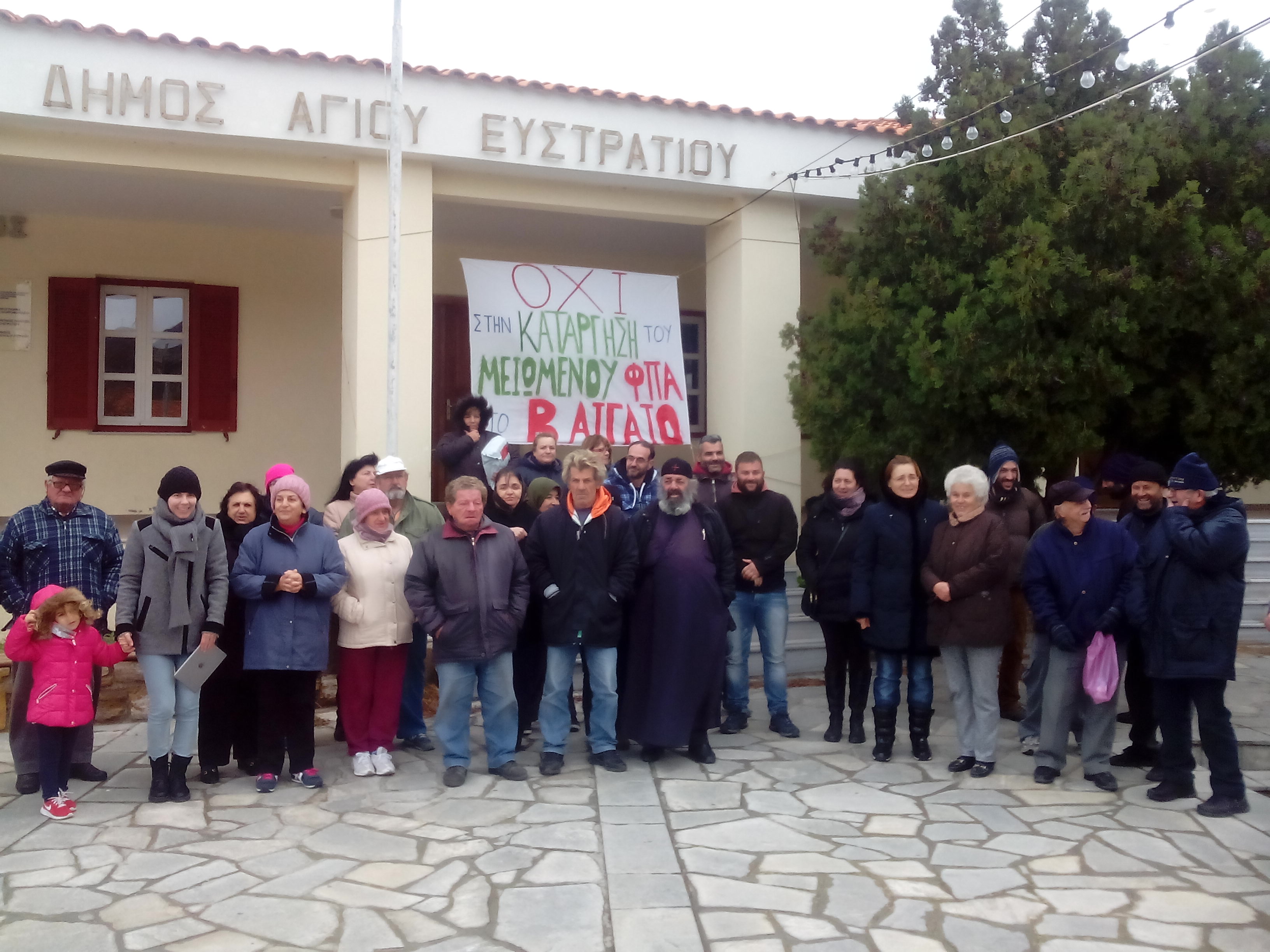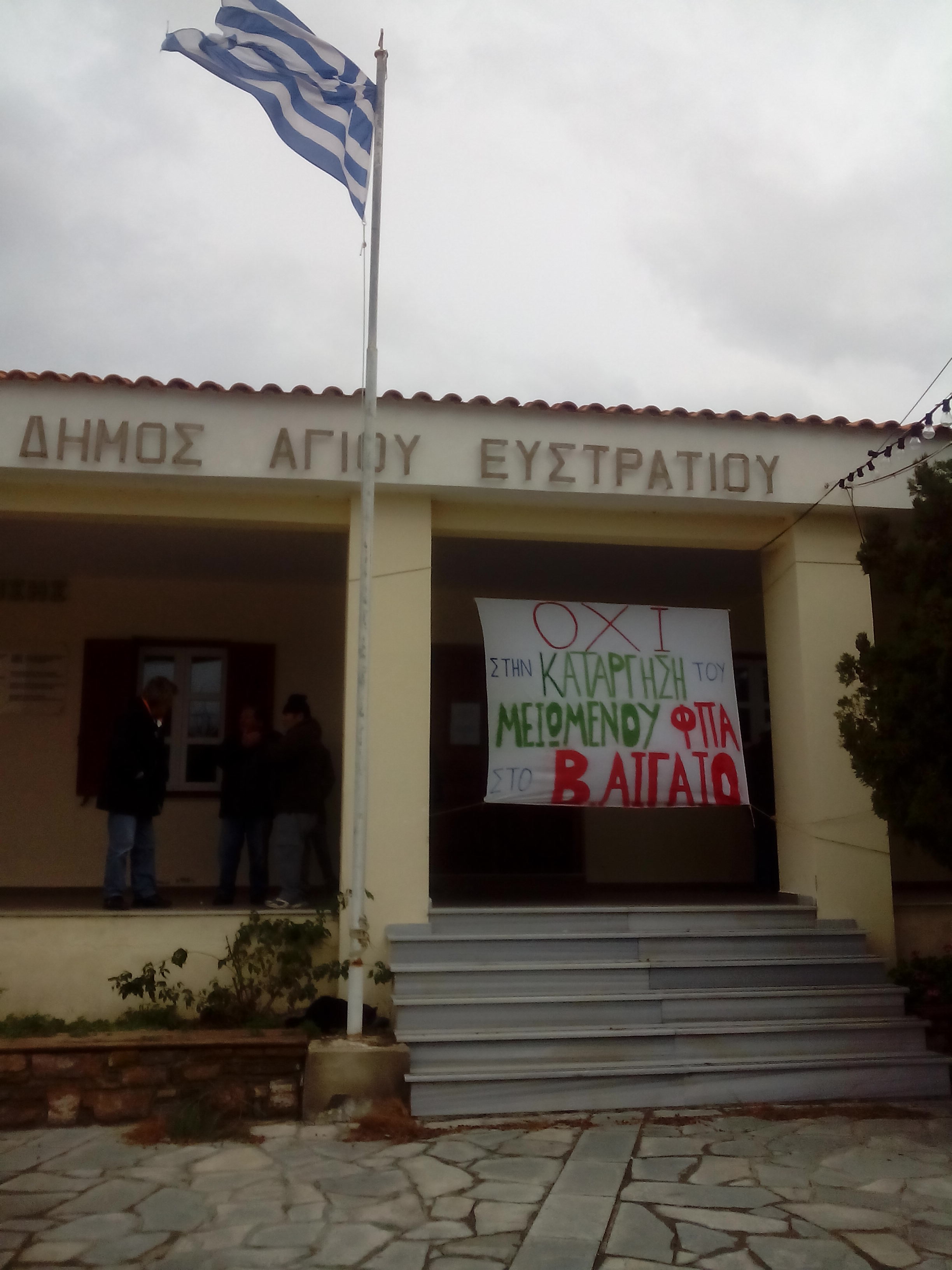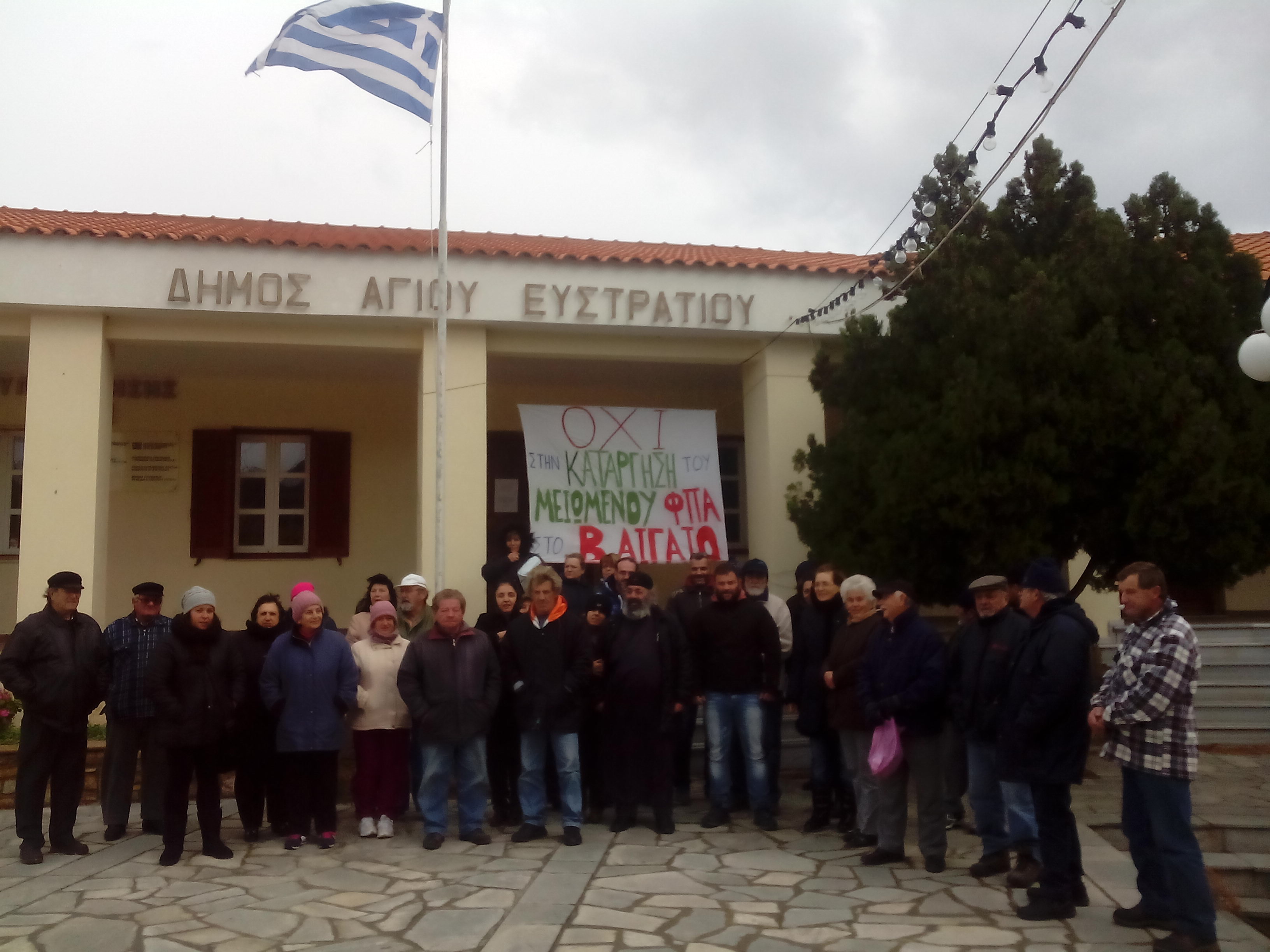 «Σύμφωνα με την ομόφωνη απόφαση του Δημοτικού Συμβουλίου Αγίου Ευστρατίου αποφασίστηκε στα πλαίσια των κινητοποιήσεων ως ένδειξη διαμαρτυρίας για την αύξηση του συντελεστή ΦΠΑ στα νησιά μας, το κλείσιμο των υπηρεσιών του Δήμου σήμερα Τετάρτη και συγκέντρωση των κατοίκων στην κεντρική πλατεία του νησιού.