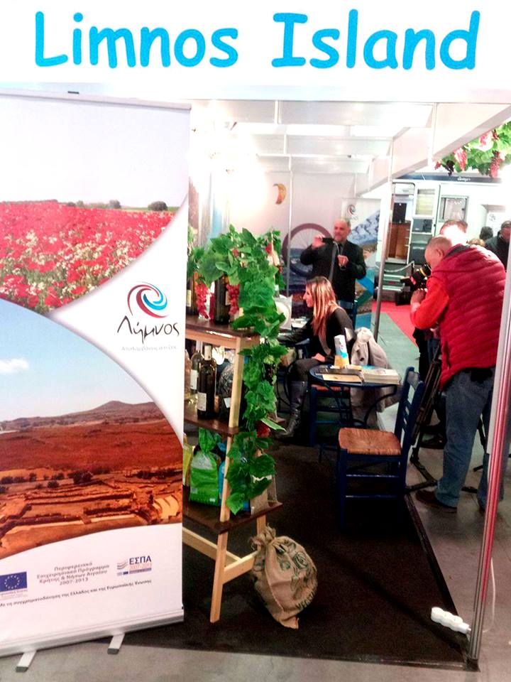 Όπως θα δείτε στις φωτογραφίες του Δήμου Λήμνου, έχει στηθεί ένα παραδοσιακό καφενείο με τα τοπικά προϊόντα του νησιού να πρωταγωνιστούν και ένα τεράστιο «παράθυρο» με φόντο το γραφικό λιμανάκι της Μύρινας και το επιβλητικό κάστρο της πόλης, να «κλείνει» το μάτι στους επισκέπτες της έκθεσης.