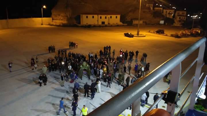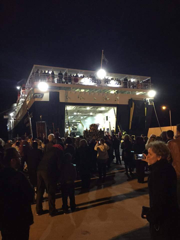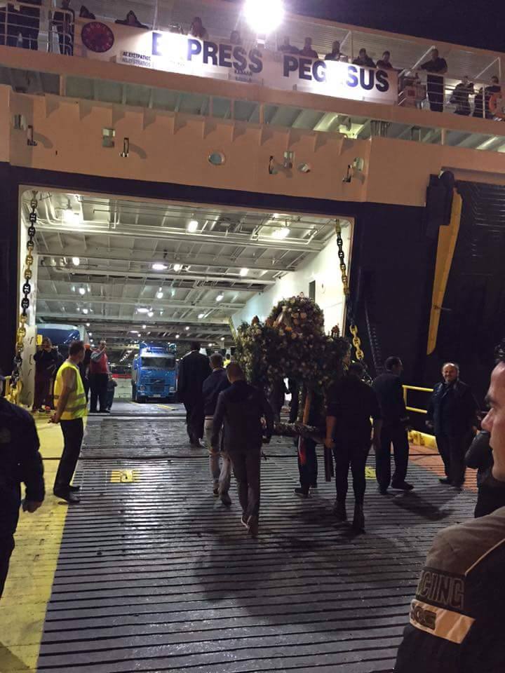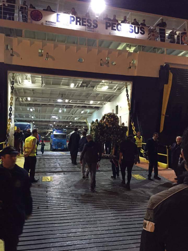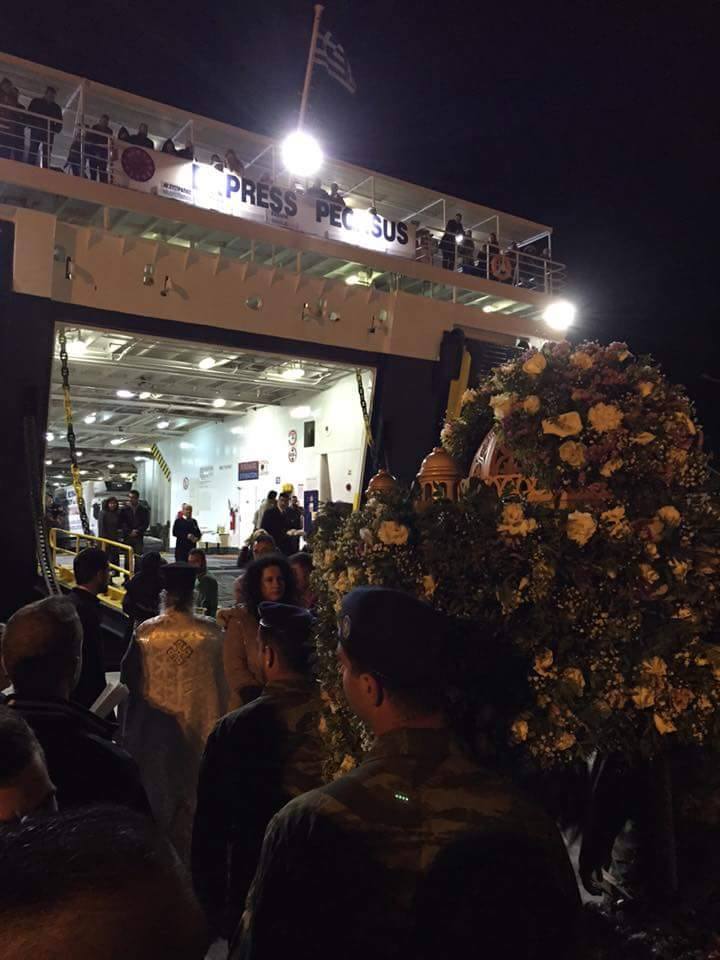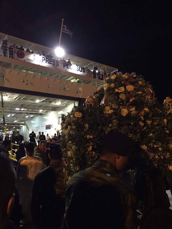 Μάλιστα ο καπετάνιος του πλοίου κατάφερε να δέσει το πλοίο στο λιμάνι την ώρα ακριβώς που έφτανε και το στρατιωτικό άγημα που συνόδευε την περιφορά και κατέθεσε στεφάνι με λουλούδια.