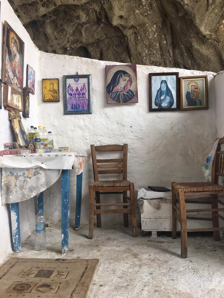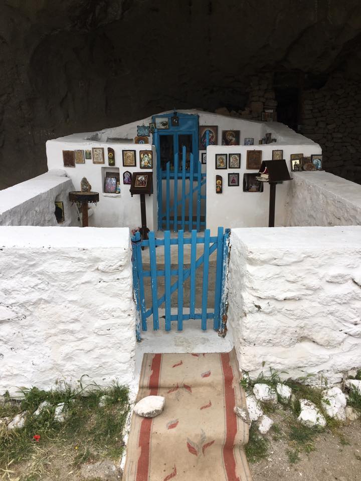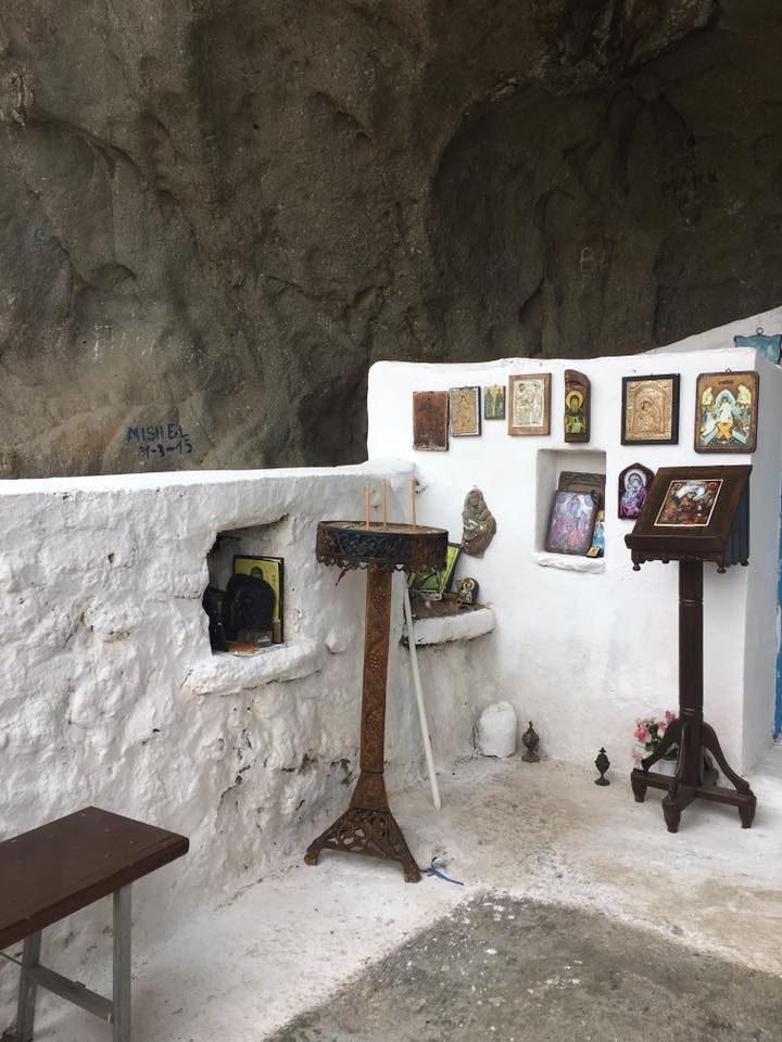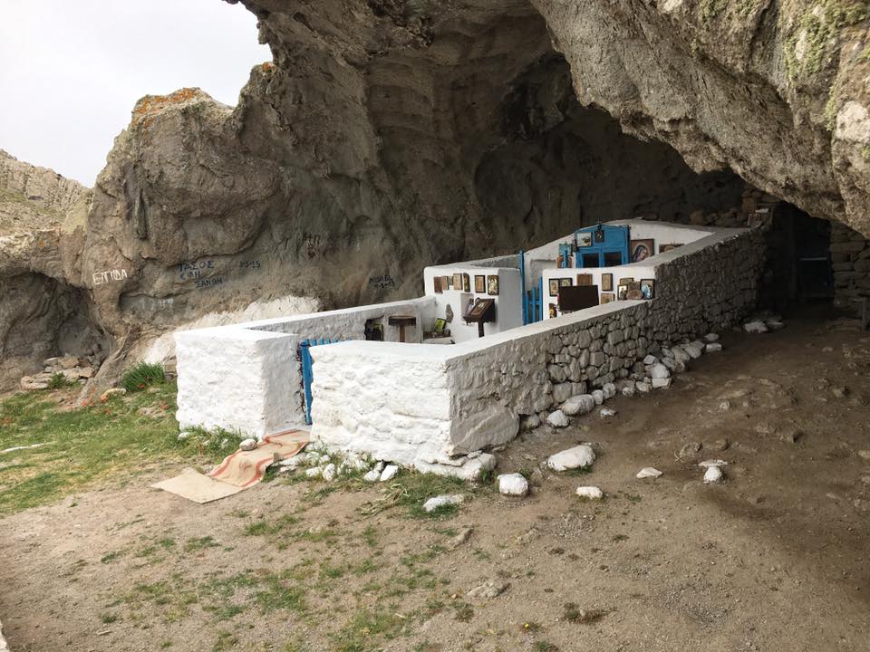 Δεν τη βλέπεις από μακριά, παρά μόνο όταν ανέβεις τα τελευταία σκαλιά και αποκαλυφθεί μπροστά σου χτισμένη μέσα στην κοιλότητα ενός απόκρημνου βράχου, που αντικαθιστά την έλλειψη σκεπής. Ιδρύθηκε απο μοναχούς που ήρθαν από τον Αη Στράτη και βρίσκεται εκεί από τις αρχές του 14ου αιώνα».
