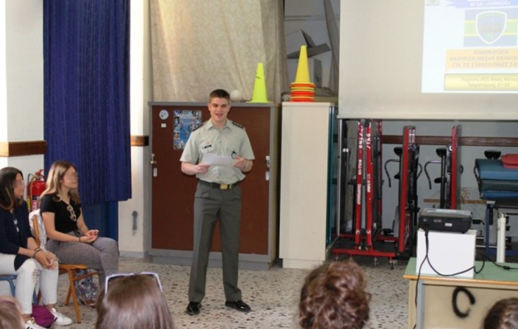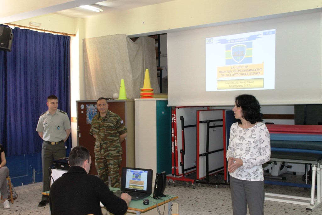 Στο πλαίσιο του επαγγελματικού προσανατολισμού, στελέχη της 88 ΣΔΙ πραγματοποίησαν ενημέρωση για τα ανώτατα και ανώτερα στρατιωτικά ιδρύματα αξιωματικών και υπαξιωματικών αντίστοιχα (ΑΣΕΙ-ΑΣΣΥ), σε μαθητές των τριών τάξεων του Γενικού Λυκείου Μύρινας.