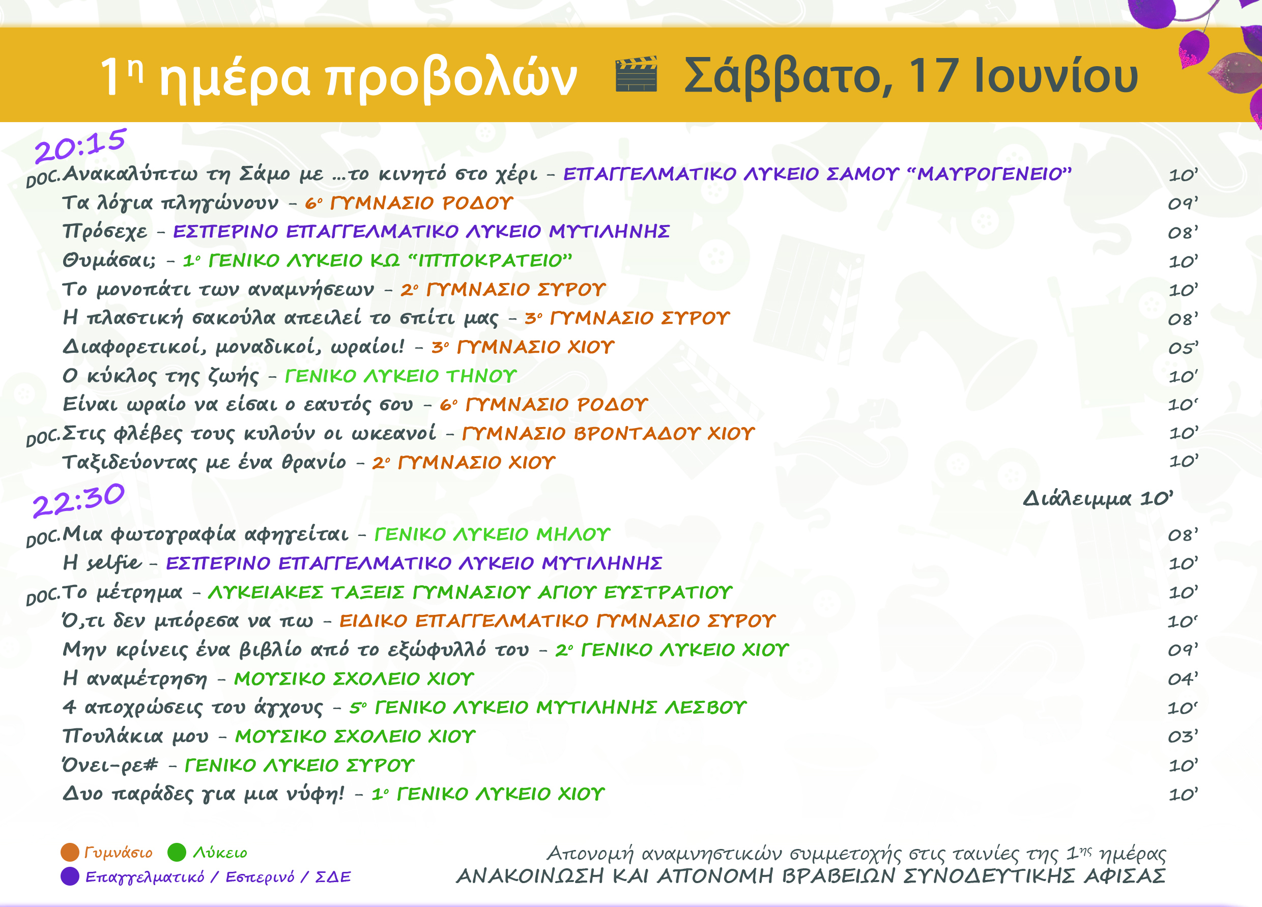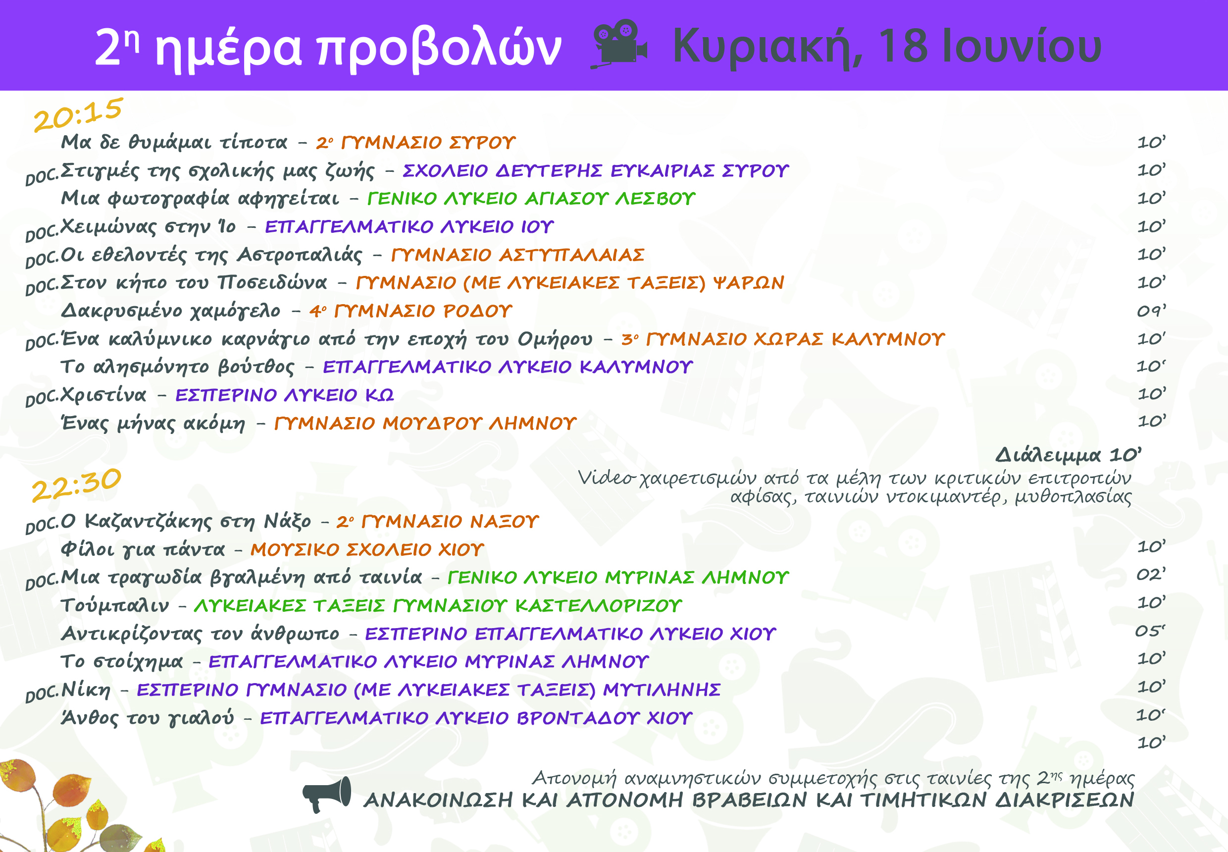 Συγκεκριμένα, 40 ομάδες από Γυμνάσια, Λύκεια και Ειδικά Σχολεία νησιών του Βορείου και Νοτίου Αιγαίου συνθέτουν με τις δεκάλεπτες ταινιούλες τους. Ένα τρυφερό αλφαβητάρι αναμνήσεων και ευαισθησίας, με ερέθισμα τα φετινά θέματα του Φεστιβάλ: «Μια φωτογραφία αφηγείται» (για τις ταινίες μυθοπλασίας), «... “Κεντώντας” το δέντρο της μνήμης»(εναλλακτικά, για τις ταινίες ντοκιμαντέρ).