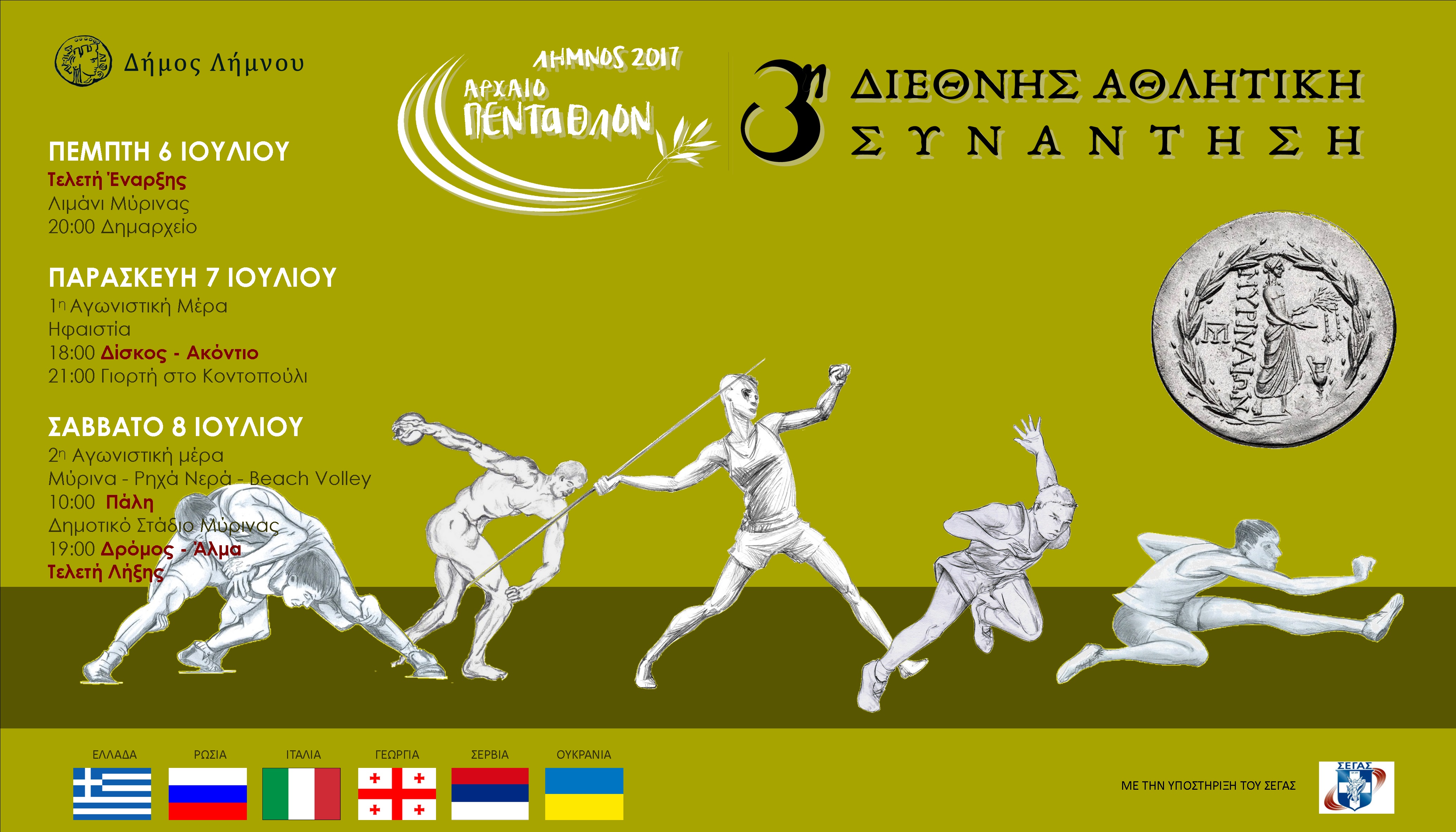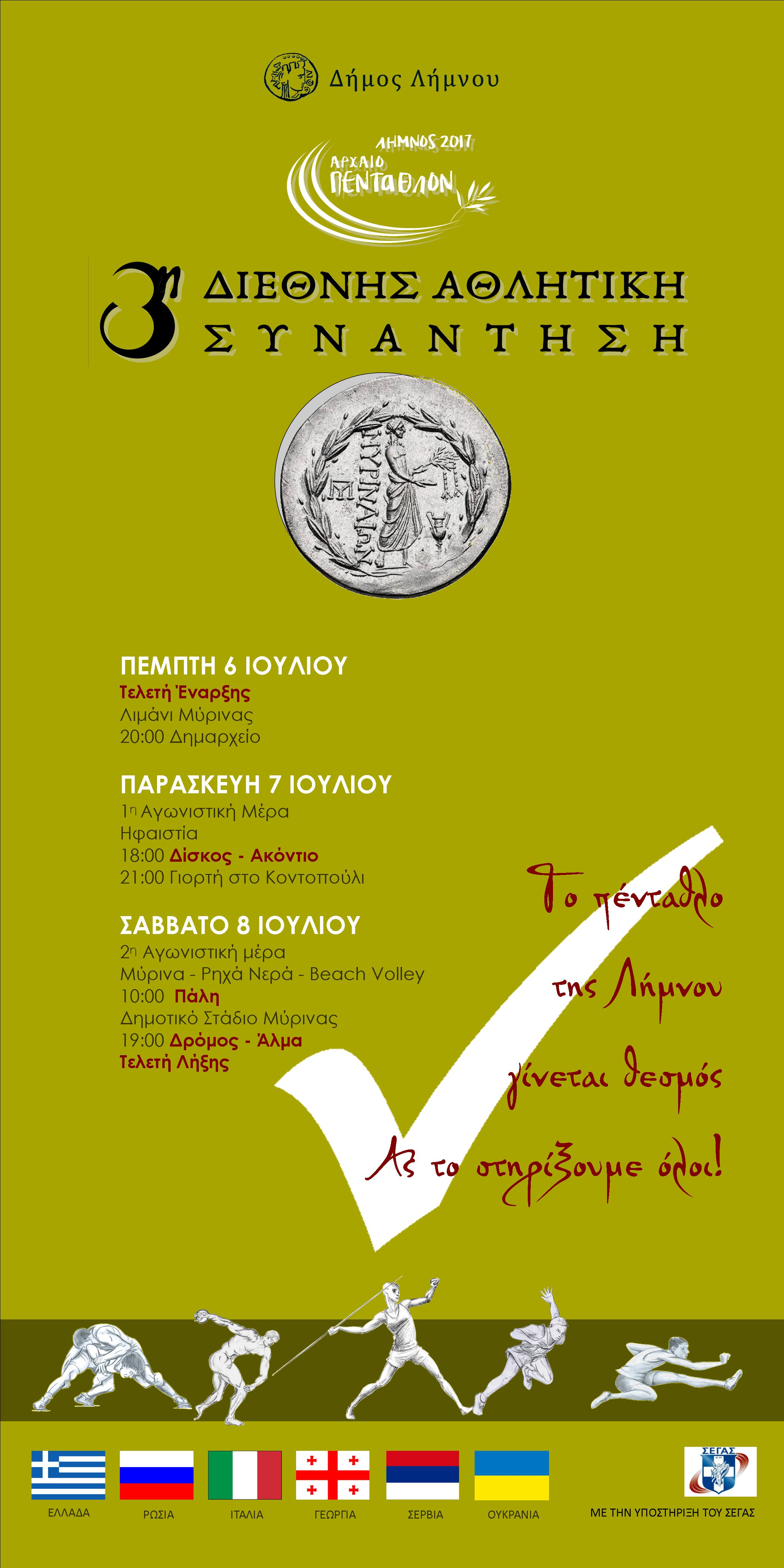 Το «Λήμνος Αρχαίο Πένταθλο 2017» που διοργανώνει ο Δήμος Λήμνου, σε συνεργασία με την Αθλητική Ένωση Λήμνου και τον Αθλητικό όμιλο «Ηφαιστία» με την υποστήριξη του ΣΕΓΑΣ, θα διεξαχθεί φέτος από τις 7 έως τις 9 Ιουλίου, με τη συμμετοχή μαθητών- αθλητών από την Ελλάδα, την Ιταλία, τη Ρωσία, τη Σερβία, τη Γεωργία και την Ουκρανία.