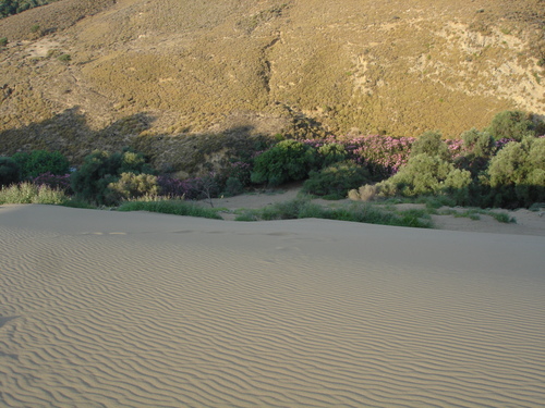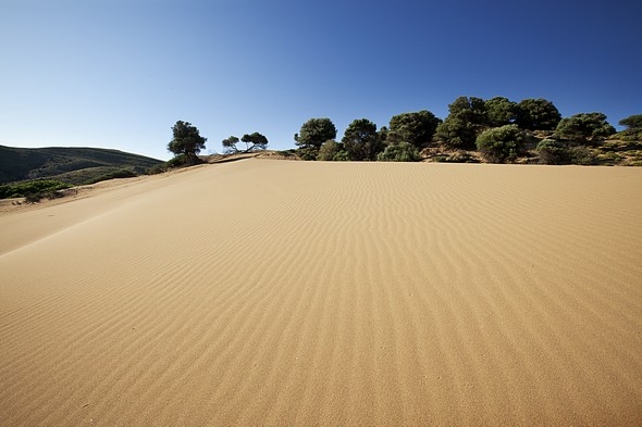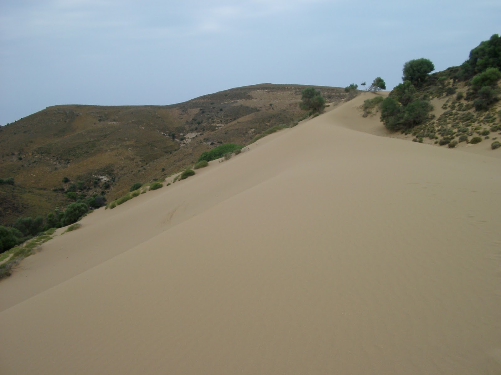Οι ντόπιοι υποστηρίζουν ότι πρόκειται για τη μοναδική έρημο στην Ευρώπη. Εκεί συναντάμε τα ερείπια του μεσαιωνικού κάστρου και του βυζαντινού πύργου της Μεγίστης Λαύρας. Στο βάθος απλώνεται ο πολύ γραφικός ορμίσκος και η παραλία Παπιάς.Καθώς προχωράμε στους αμμόλοφους, ανεβαίνοντας προς τις Παχιές Αμμουδιές, μια δύσκολη, αλλά εκπληκτική διαδρομή, θα βρεθούμε στη μέση μιας απρόσμενης ερήμου, κάτι που μαρτυρά την παρουσία θάλασσας στην περιοχή, στη παλαιολιθική εποχή.