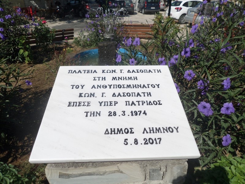 Τα αποκαλυπτήρια της σχετικής πλάκας, η οποία τοποθετήθηκε στο κέντρο της πλατείας της Τ.Κ. Ρεπανιδίου, έκαναν ο Δήμαρχος Λήμνου κ. Δημήτρης Μαρινάκης και ο Αδελφός του Κωνσταντίνου Δασοπάτη, κ. Βασίλειος Δασοπάτης, παρουσία των μελών της οικογένειας του πεσόντα, του Αντιπεριφερειάρχη κ. Κωνσταντίνου Αδαμίδη, του Προέδρου του Δημοτικού Συμβουλίου κ. Παναγιώτη Μαυροθαλασσίτη, του Στρατιωτικού Διοικητή Λήμνου Ταξίαρχου Γρηγόριου Ρουμάνη, του Διοικητή της 130 Σμηναρχίας Μάχης Σμήναρχου Ευάγγελου Παναγιώτου και λοιπών εκπροσώπων των ενόπλων δυνάμεων και των σωμάτων ασφαλείας, του Αντιδημάρχου κ. Σαράντη Πανταζή και του Εκπροσώπου της Τοπικής Κοινότητας Ρεπανιδίου κ. Κωνσταντίνου Ζαφειρίου.