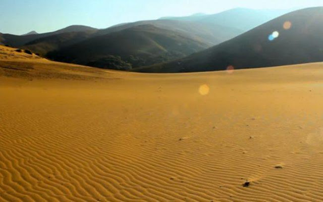 Μια ατελείωτη επιφάνεια, 70 στρεμμάτων, μακριά από τη θάλασσα γεμάτη άμμο, με αμμόλοφους που αλλάζουν διαρκώς σχήμα, όπως ακριβώς και στη Σαχάρα, ανάλογα με το πώς τους… συνθέτει ο βοριάς.