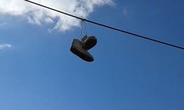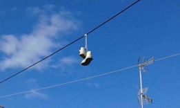 Είναι ένα ζευγάρι παπούτσια κρεμασμένα εδώ κ κάτι μήνες επάνω σ καλώδιο της Δ.Ε.Η. Κατά την γνώμη μου, είναι μια άσχημη εικόνα και δεν μπορώ να καταλάβω γιατί δεν έχουν κατέβει ακόμα.