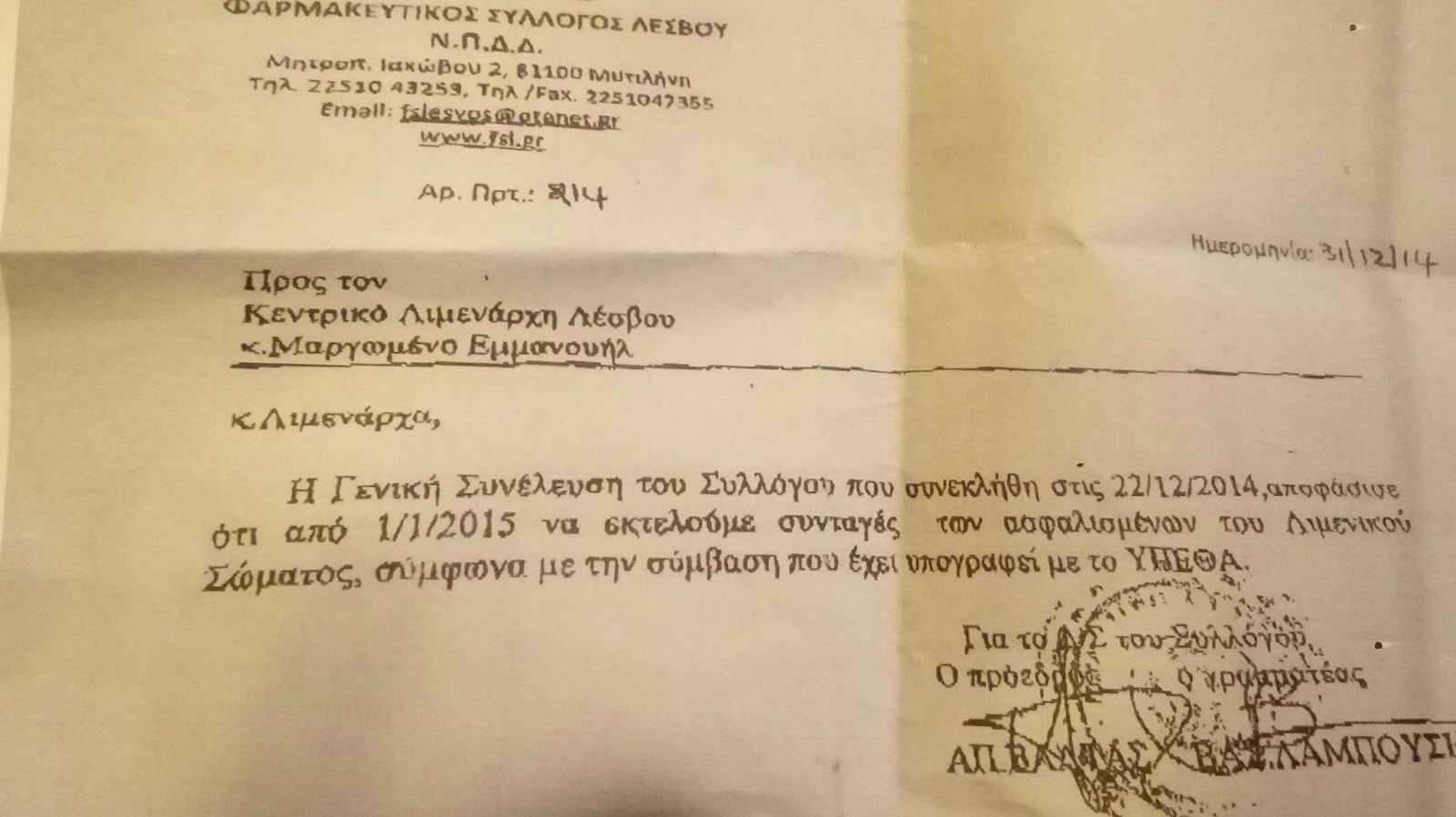 Μετά από αλλεπάλληλες ενέργειες λιμενικών και αρκετές πιέσεις συνδικαλιστών και μη εν μέσω και του μεταναστευτικού, ο Φαρμακευτικός Σύλλογος αποφάσισε να ξεκινήσει εκ νέου την χορήγηση, ενημερώνοντας μάλιστα σχετικά το Λιμεναρχείο στη Μυτιλήνη με αυτή την επιστολή: