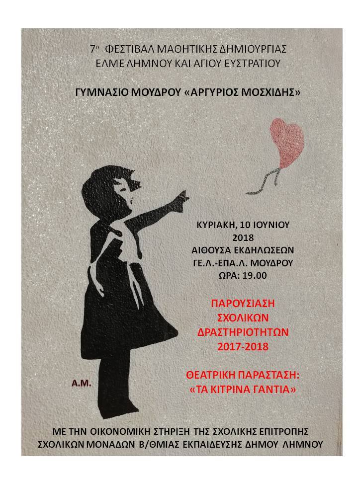 Το Γυμνάσιο Μούδρου «Αργύριος Μοσχίδης» σας προσκαλεί την Κυριακή 10 Ιουνίου και ώρα 7.00 μ.μ. στην αίθουσα εκδηλώσεων του ΓΕ.Λ. – ΕΠΑ.Λ. Μούδρου να παρακολουθήσετε την παρουσίαση των σχολικών δραστηριοτήτων που πραγματοποιήθηκαν κατά τη φετινή σχολική χρονιά.