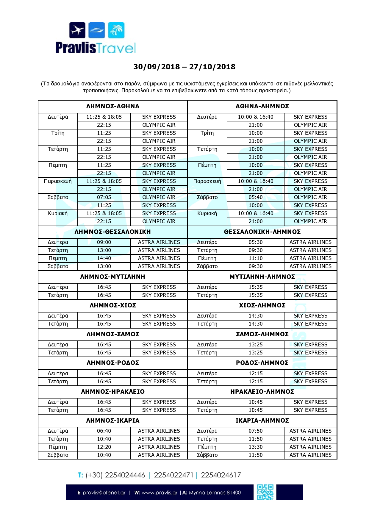 Μπορείτε να δείτε αναλυτικά τα δρομολόγια Οκτωβρίου της Sky Express και όλα τα αεροπορικά δρομολόγια που εξυπηρετούν το νησί της Λήμνου στον επισυναπτόμενο πίνακα.