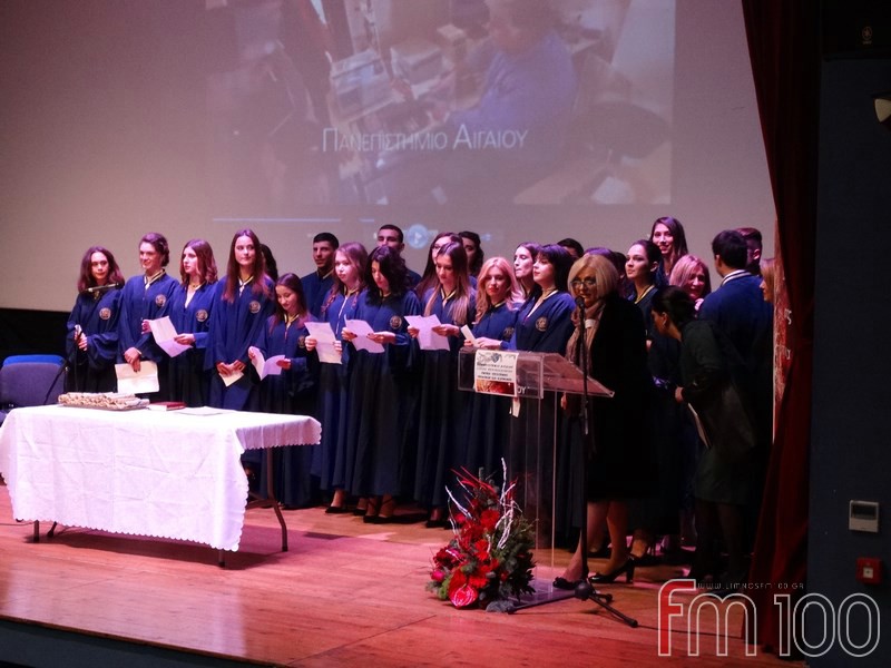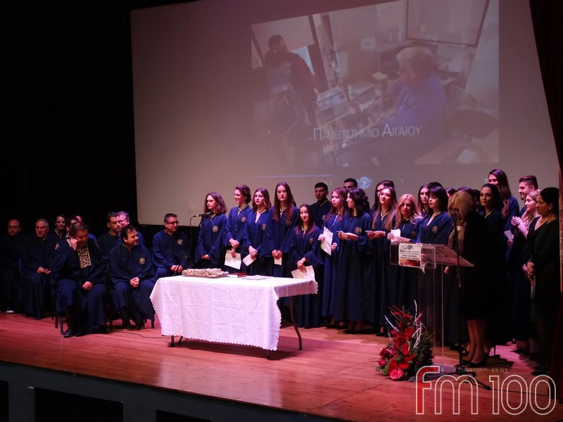 Η εκδήλωση στην οποία συμμετείχαν 25 πτυχιούχοι φοιτητές μαζί με τα αγαπημένα τους πρόσωπα που ήταν εκεί στη χαρά τους, πραγματοποιήθηκε στην αίθουσα του «Μαρούλα», παρουσία του Αντιπρύτανη του Πανεπιστημίου Αιγαίου κ Παπαγεωργίου.