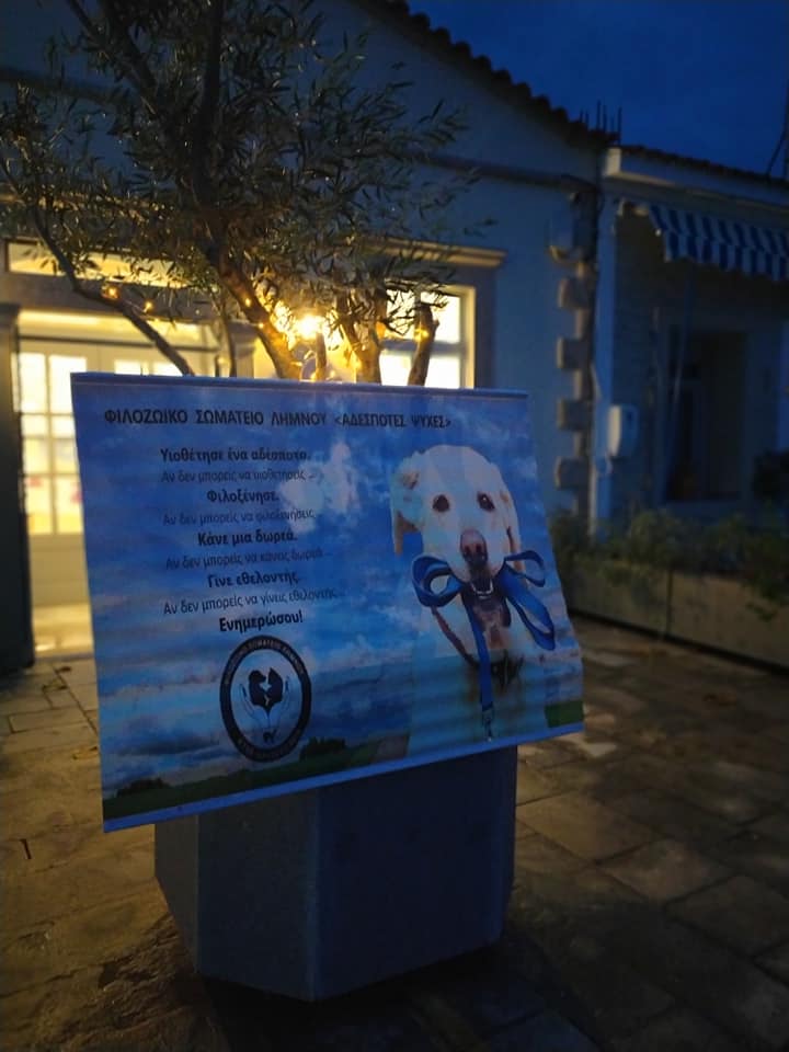 Ιδιαίτερα θέλουμε να ευχαριστήσουμε τους μαθητές του Γυμνασίου Μύρινας που προσέφεραν τις δημιουργίες τους για τα αδέσποτα του νησιού και έδωσαν μια διαφορετική νότα φρεσκάδας και ενθουσιασμού στην εκδήλωση με τον δικό τους ξεχωριστό τρόπο, τους γονείς τους που διδάσκουν στα παιδιά τους την αγάπη για τα ζώα και την καθηγήτριά τους Μαίρη Γεροντάρα για την όλη διοργάνωση.