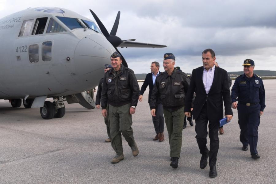 Αρχικά, ο Υπουργός μετέβη στην 135 Πτέρυγα Μάχης (135 ΠΜ) στη Σκύρο, όπου συνoμίλησε κι αντήλλαξε ευχές με τα πληρώματα και τους τεχνικούς των Αεροσκαφών Επιφυλακής (Readiness). Αμέσως μετά επισκέφθηκε το ραντάρ της 7ης Μοίρας Σταθμού Ελέγχου και Προειδοποίησης (7η ΜΣΕΠ) και τον Ναυτικό Σταθμό Σκύρου (ΝΑΣΣΚΥ).