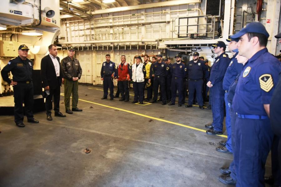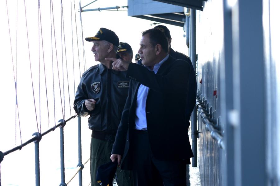 Ακολούθως, ο Υπουργός Εθνικής Άμυνας μετέβη με ελικόπτερο στη Φρεγάτα «ΝΑΒΑΡΙΝΟΝ» που εκτελεί χρέη πλοίου «φυλακής σκοπούντος» στο Βόρειο Αιγαίο, όπου αντήλλαξε ευχές με το πλήρωμα.