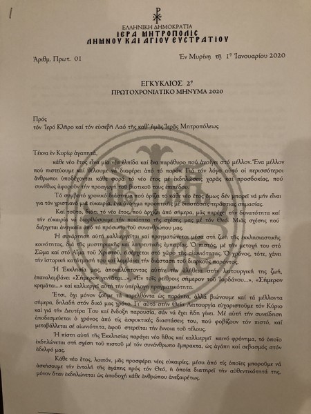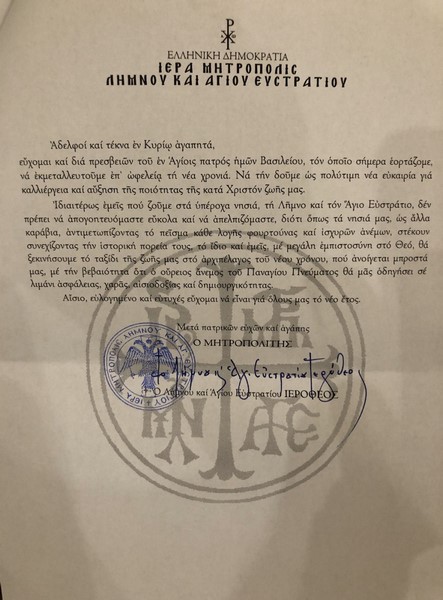 Στο πρωτοχρονιάτικο μήνυμα ο Σεβασμιώτατος Μητροπολίτης ευχήθηκε: «Το νέο έτος να είναι για όλους αίσιο, ευλογημένο και ευτυχές», τονίζοντας «να δούμε τη νέα χρονιά ως πολύrτιμη νέα ευκαιρία για καλλιέργεια και αύξηση της ποιότητας της κατά Χριστόν ζωής μας».
