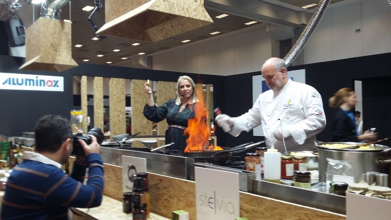 fine food ενοτήτων «Μαγειρεύουμε Ελλάδα» με οικοδέσποινα την Αργυρώ Μπαρμαρίγου και “Greek Dish Challenge” με οικοδεσπότη τον Κώστα Μπουγιούρη και παρουσιάστρια τη foodbloger Εύα Παρακεντάκη, ο Μυτιληνιός executive chef Παναγιώτης Μελιδώνης, προσκεκλημένος της Π.Β.Α., παρουσίασε με “live cookings” 5 πιάτα –παραδοσιακές και gourmet συνταγές (χάχλες με αυγά & παστουρμά, στραπατσάδα με σουτζούκι, φλομάρια με λουκάνικα και σάλτσες, χυλοπίτες με σαρδέλες, τυροκροκέτες με λαδοτύρι), ενώ με τη βοήθεια των φοιτητών του Ι.Ε.Κ. ΑΚΜΗ προετοίμασε πλούσια εδέσματα με τα προϊόντα των νησιών του Βορείου Αιγαίου, τα οποία γεύθηκαν οι επαγγελματίες επισκέπτες και το κοινό.