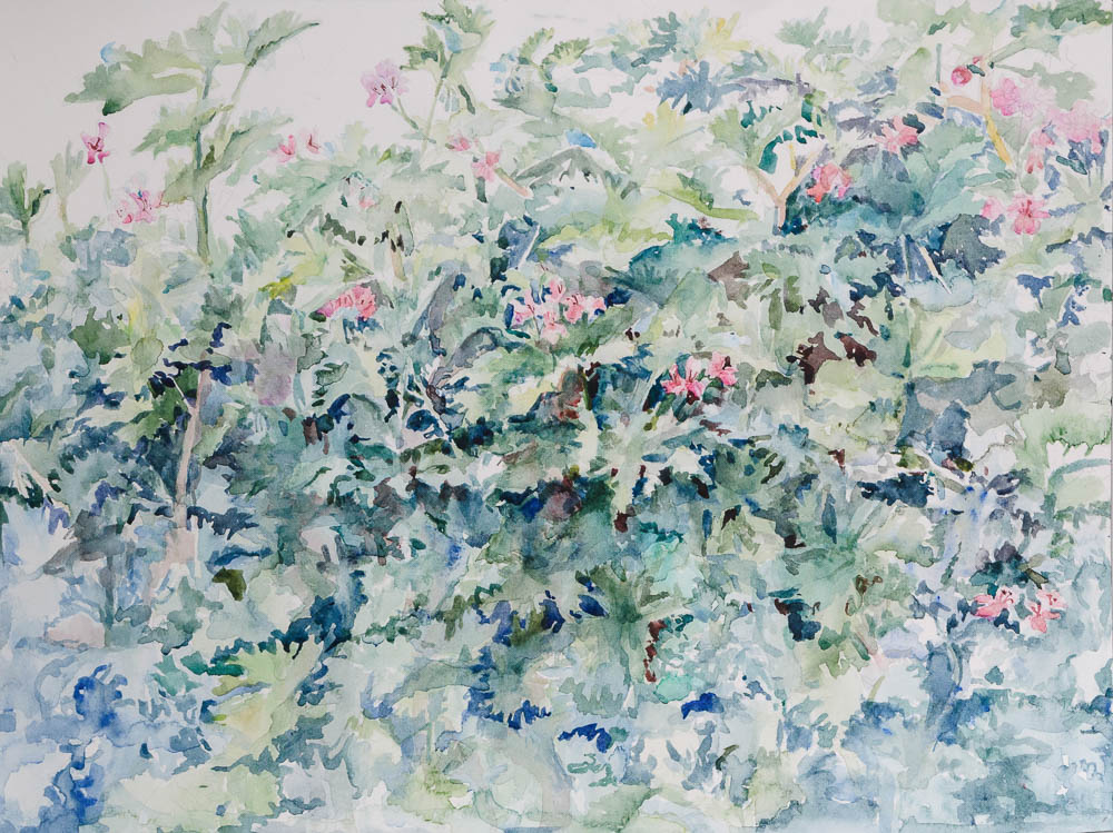 Τα έργα της Μαρίας Τζιροζίδου προέρχονται από την τελευταία ενότητα δουλειάς της, τους «Κυκλαδικούς Κήπους», όπου προσπαθεί να «μεταδώσει την ατμόσφαιρα του τοπίου των κήπων του άμεσου περιβάλλοντός της», με τα ανοιξιάτικα αγριολούλουδα, τα μωβ της λεβάντας, τα κίτρινα, τα καφέ και τα κίτρινα του καλοκαιριού και τα πράσινα του χειμώνα να αποτελούν την έμπνευσή της. Η ρευστότητα και η διαύγεια της ακουαρέλας συντείνει καθοριστικά στην ευαισθησία και τον ρομαντισμό που αποπνέουν οι εικόνες της.