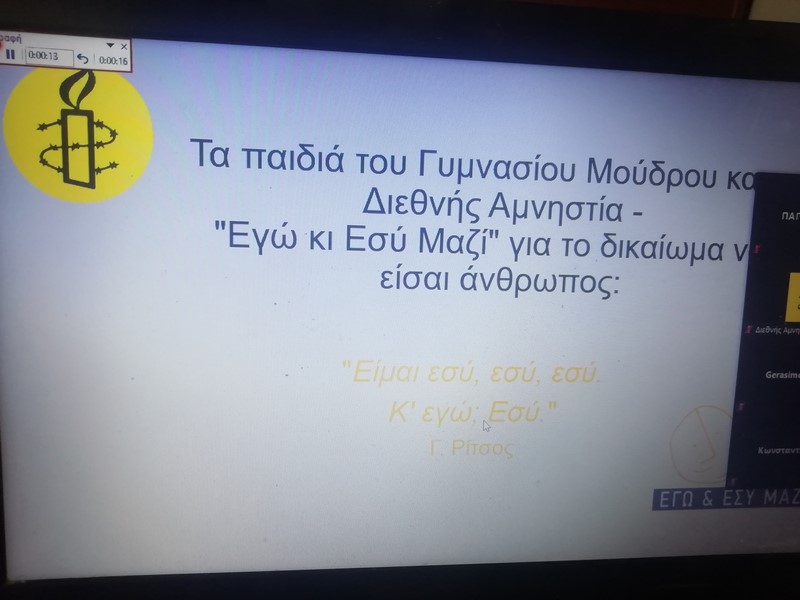 Ειδικότερα, στη σχετική ανακοίνωση του σχολείου αναφέρεται: «Με τα θερμότερα λόγια για το Γυμνάσιο Μούδρου και για τις καινοτόμες δράσεις του εκφράστηκε η υπεύθυνη του προγράμματος "Εγώ κι εσύ μαζί" του ελληνικού τμήματος της Διεθνούς Αμνηστίας, κ. Χατζηνικολάου, καθώς επιλεχθήκαμε ως ένα από τα δύο σχολεία που παρουσίασαν τις καλές πρακτικές τους στην εξ αποστάσεως επιμόρφωση των εκπαιδευτικών για τα ανθρώπινα δικαιώματα. Το πρόγραμμα συντόνισαν κατά το τρέχον σχολικό έτος οι κ.κ. Παπαπαναγιώτου Μαρία, Βρανά Τριανταφυλλιά και Αγάθου Κατερίνα. Το Γυμνάσιο Μούδρου έχει καταξιωθεί στο χώρο της εκπαίδευσης σε πανελλήνια κλίμακα ως ένα σχολείο εξωστρεφές, καινοτόμο, που καλλιεργεί στους μαθητές του την ενσυναίσθηση και ενδυναμώνει την προσωπικότητα τους».