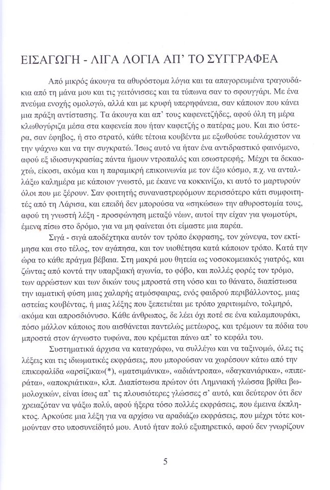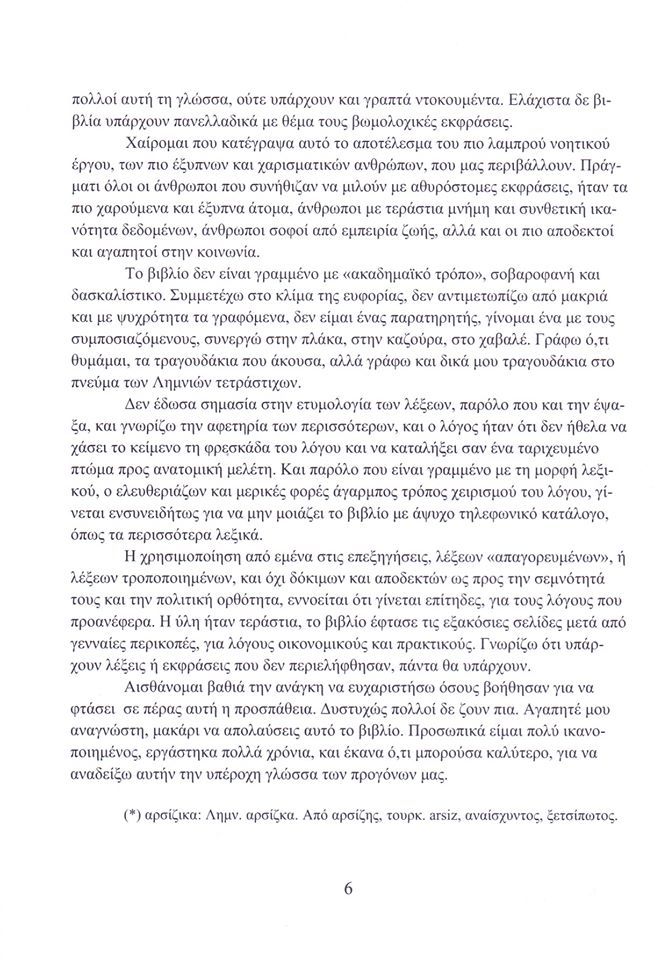 Μας προσφέρει, λοιπόν, ο αγαπητός Σταύρος ένα ογκώδες λεξικό 600 σελίδων με τα "αρσίζκα τς Λήμνος", έργο πολύτιμο όχι μόνο για τον φιλοπερίεργο αναγνώστη που θα αναζητήσει τις γενετήσιες λέξεις και φράσεις χάριν γούστου και παιδιάς αλλά ιδιαίτερα σημαντικό για τον ερευνητή των ελληνικών διαλέκτων και ιδιωμάτων. Το υλικό που παραθέτει είναι τεράστιο.