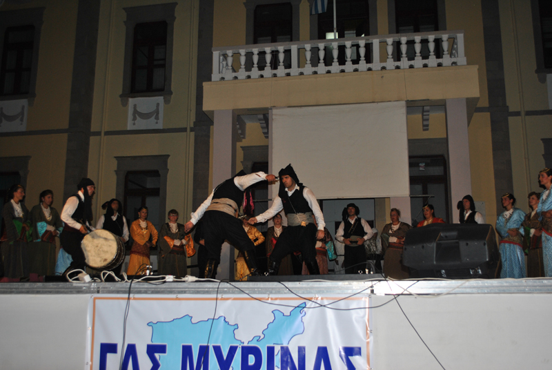 Η εκδήλωση ξεκίνησε με την "παρέλαση" των χορευτών, συνοδεία παραδοσιακών οργάνων, από το λιμάνι της Μύρινας προς τον χώρο του Γυμνάσιου και έτυχε της εντυπωσιακής αποδοχής των διερχόμενων τουριστών, οι οποίοι ενθουσιάστηκαν από το φολκλορικό στοιχείο και έσπευσαν να φωτογραφηθούν με τους χορευτές.