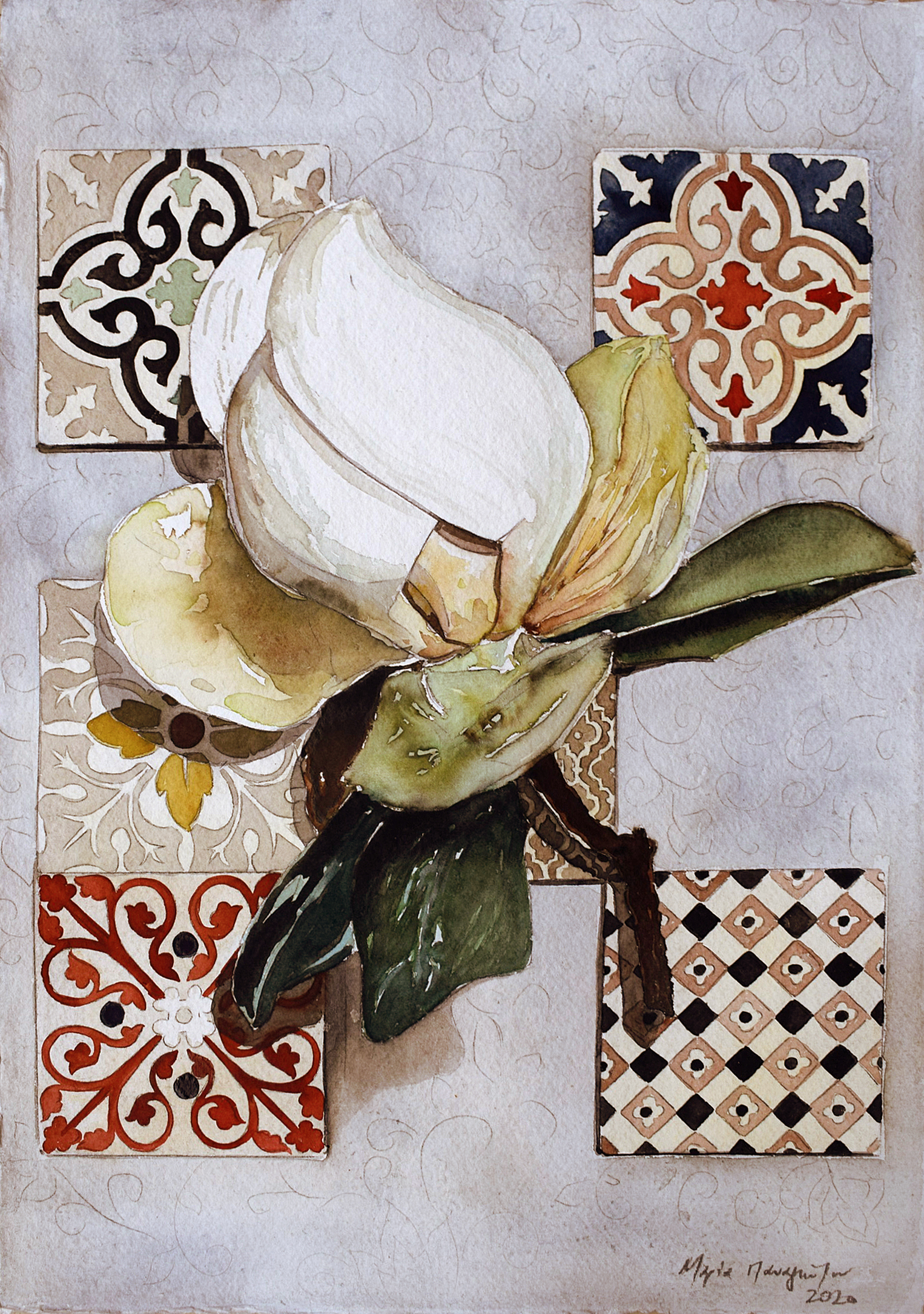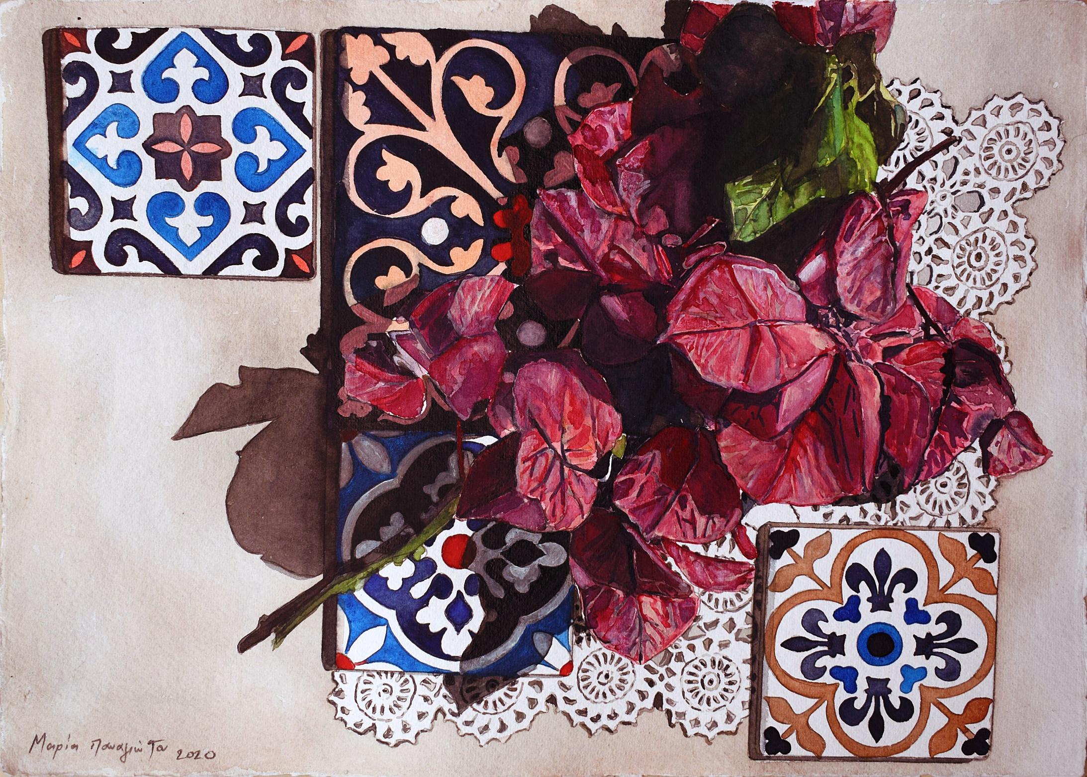 Η περιρρέουσα ποιητική ατμόσφαιρα στα έργα της Μαρίας Παναγιώτου ενισχύεται από τις σχεδιαστικές και χρωματικές ποιότητες της ζωγραφικής της. Στις πιο πρόσφατες συνθέσεις της, η θεματική της επικεντρώνεται σε λουλούδια παρουσιασμένα πάνω σε σπαράγματα παλιών πατωμάτων. Πρόκειται για συνθέσεις που επιβάλλονται με την ευαισθησία της απόδοσής τους, τη λεπτότητα και την ακρίβεια των χρωματικών τους τόνων. Η εντύπωση είναι άμεση και γοητευτική, ζωντανή και ρομαντική. Η ζωγράφος, με την ισχυρή περιγραφή και αποτύπωση του συγκεκριμένου, οδηγείται σε μια διαφορετική αντίληψη θέασης και ερμηνείας του, επιζητά να αποκαλύψει αυτό που βρίσκεται κρυμμένο πίσω από την επιφάνεια, να απεικάσει τη ζωτική της σχέση με τον κόσμο και το οικείο περιβάλλον της, σε αντιστοιχία με ψυχικές και συναισθηματικές καταστάσεις.