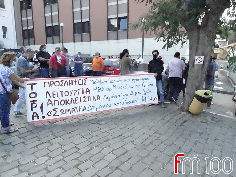 Αν και η συγκέντρωση ήταν προγραμματισμένη για την είσοδο των επειγόντων, τελικά πραγματοποιήθηκε στην αυλή του παλιού κτηρίου. Ομιλητές ήταν ο κ. Μαδυτινός από την ΑΔΕΔΥ, ο κ. Κατσιγιαννόπουλος από την Ένωση Νοσοκομειακών Ιατρών και ο κ. Ξυπτεράς από την ΕΛΜΕ Λήμνου.