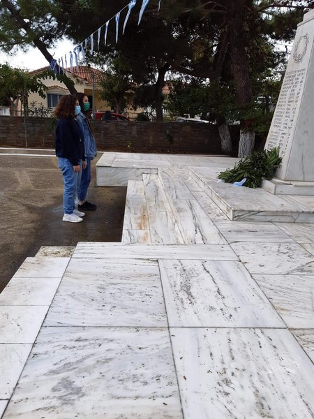 Ακολούθησε κατάθεση στεφάνου στο Ηρώον του Μούδρου από τις μαθήτριες της Γ' τάξης, Νεκταρία Γιαννέλη και Χριστίνα Σουλντίσα. Κατά τη διάρκεια των εκδηλώσεων τηρήθηκαν όλα τα υγειονομικά πρωτόκολλα.